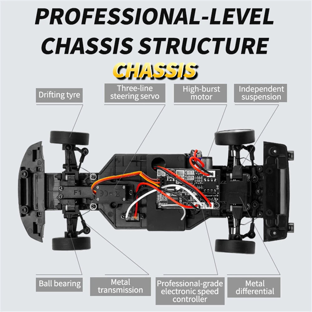 Boutique drift, multi -link design. Style 1:18 restores the original car, and the appearance is completed in the actual proportion. simulation metal body shell,built -in gyroscope auxiliary system, 2.4G 3 channel remote control (with prompt sound), metal transmission shaft, customized 150 high -speed motor, drift tires, headlights can be remotely controled C key to control, linkage vehicle lights (steering light, reversing lights, brake lights), four-wheels independent suspension, full car ball bearings, 9g steering servo, battery life can sustainable electricity for 20-30 minutes, fully proportional linear control throttle and steering, motor with locked rotor protection,the battery circuit board is overcharged, over-put, low-voltage protection, automatic bind frequency