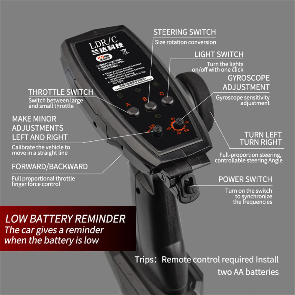 | Transmitter | Frequency:2.4G Channel:3CH Remote Distance:20m Required Battery:2X 1.25V AAA battery(not included) |