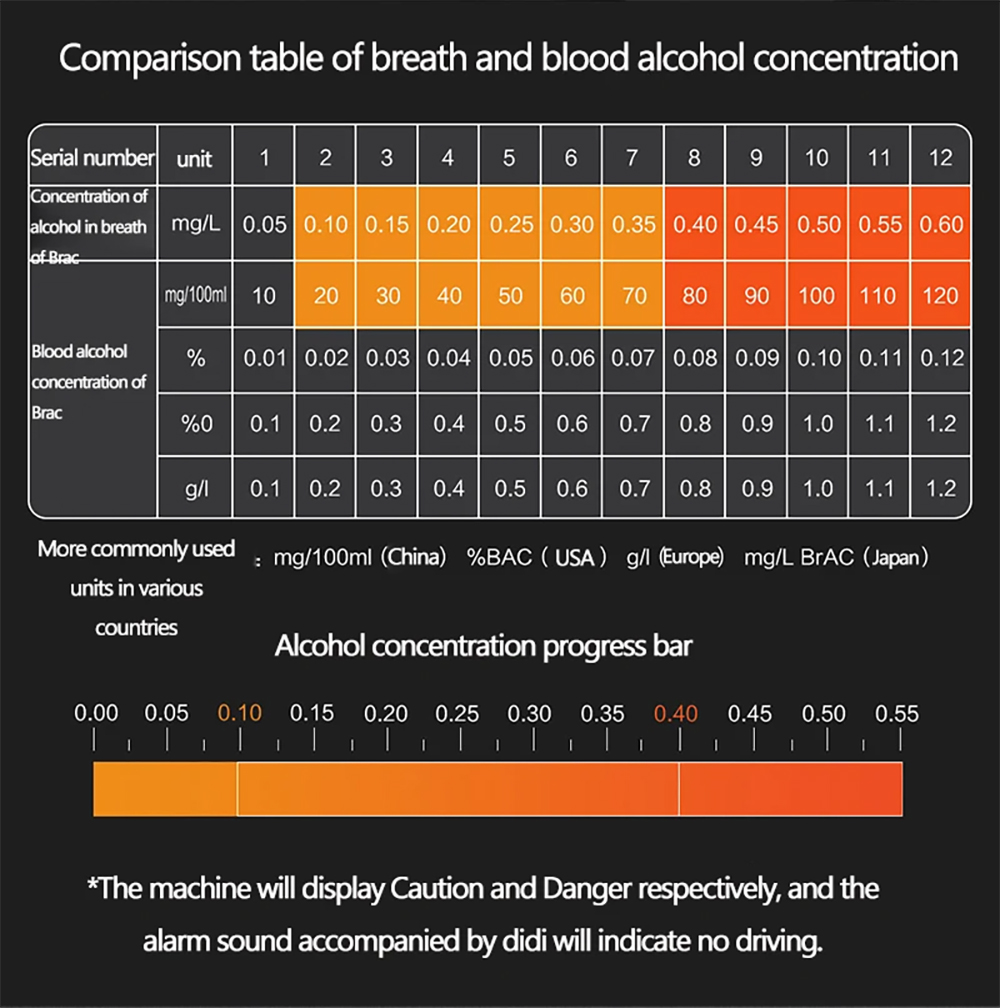 - Audible Alert System: Depending on the alcohol concentration level, different beeping sounds alert the user to exceedance of the legal limits, making it clear whether the user is over the limit or not.