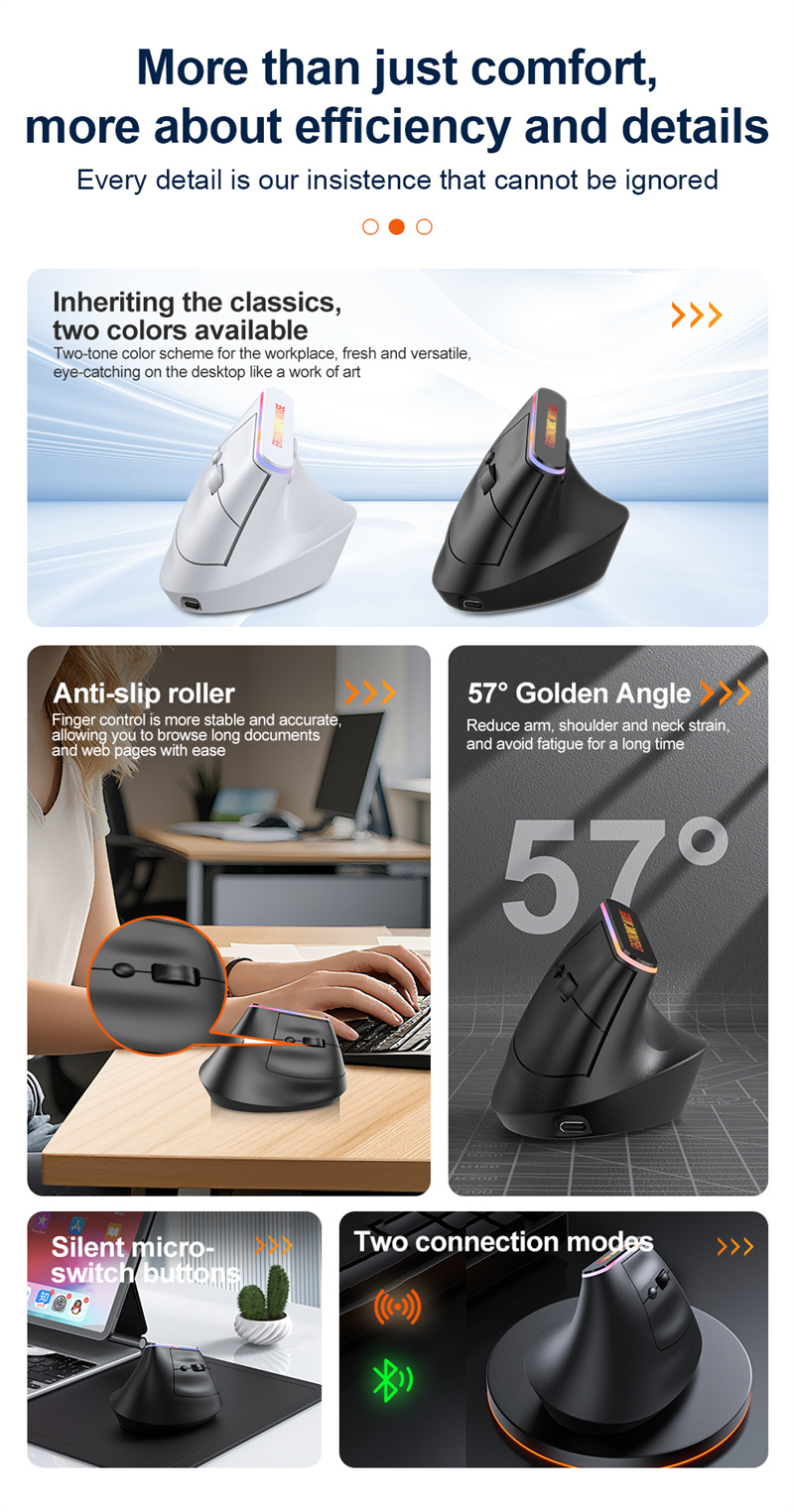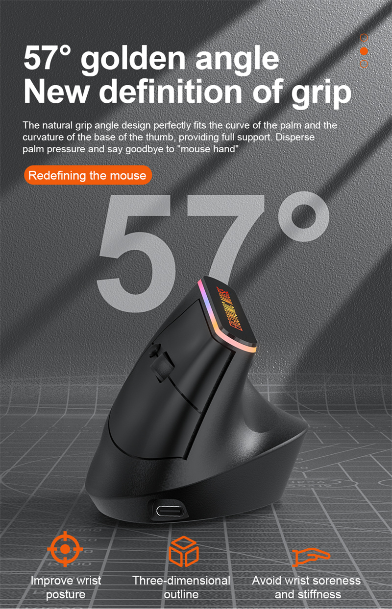 2. 57° Natural Grip Angle: Minimizes stress on the arm, reducing fatigue and the risk of 'mouse hand.'