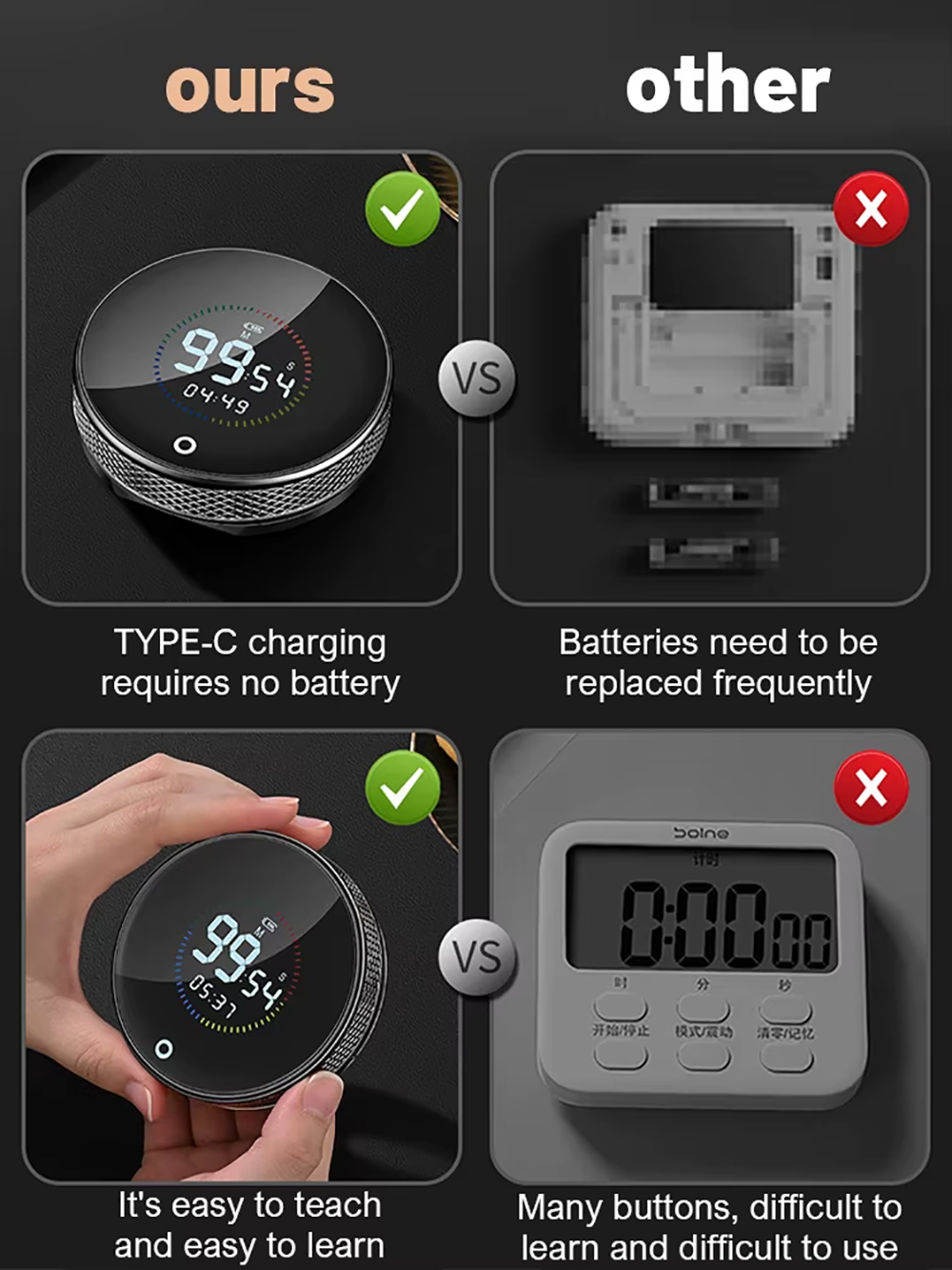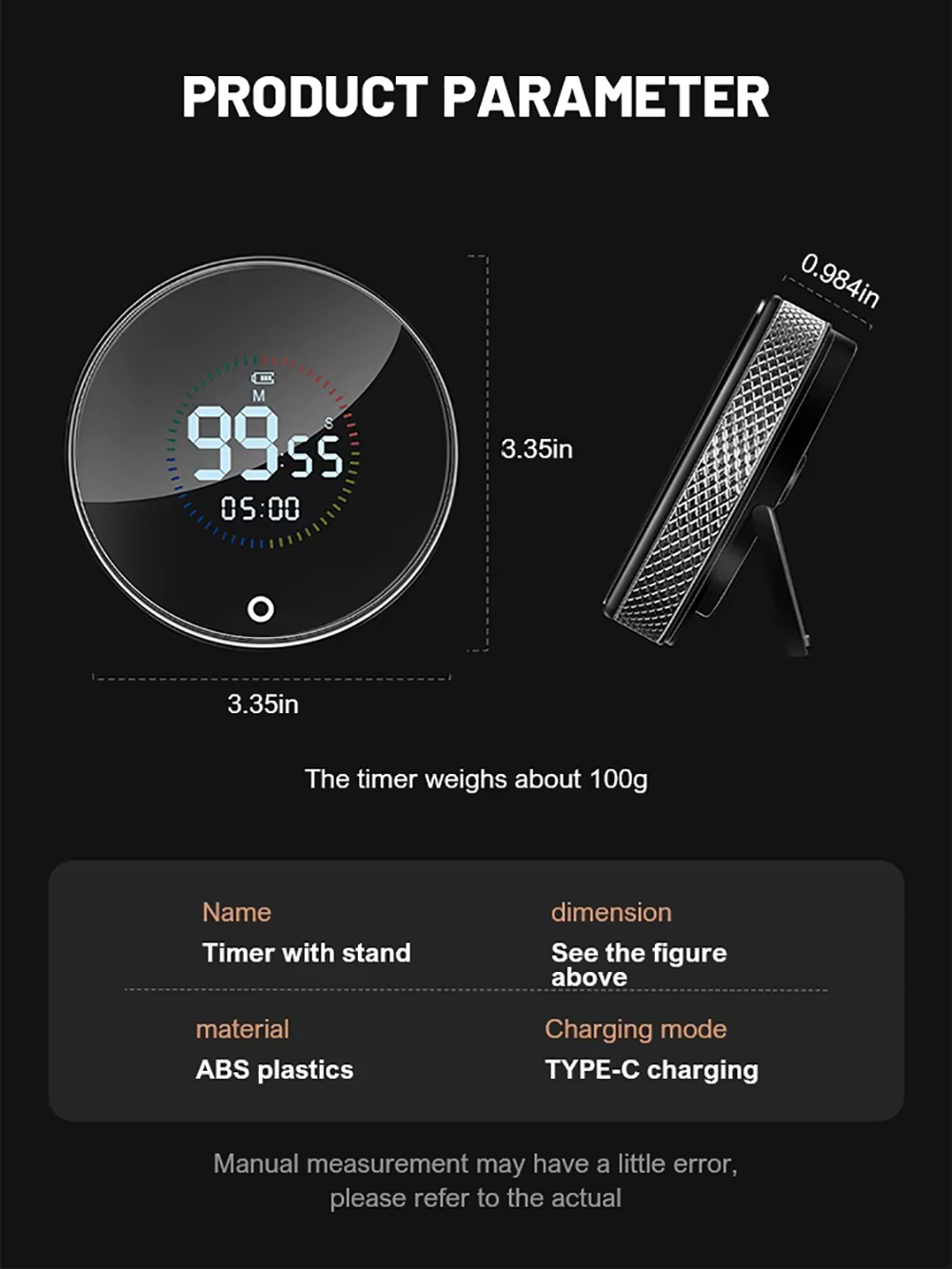 - Built-In Stand: The timer includes a concealed stand that allows you to place it anywhere you need. Whether it's on a kitchen counter or a desk, the stand offers flexibility and ease of use.