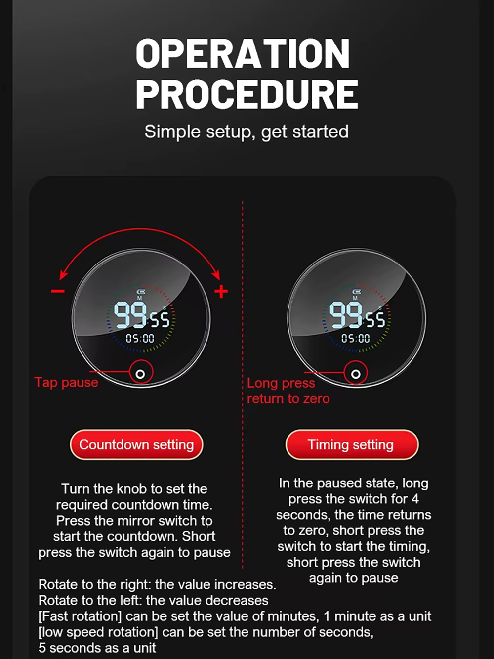- User-Friendly Operation: The large digital timer is incredibly easy to use. You can adjust the time simply by twisting the outer ring, and start or stop the countdown with a single touch of a button. Perfect for anyone, regardless of technical skill level.
