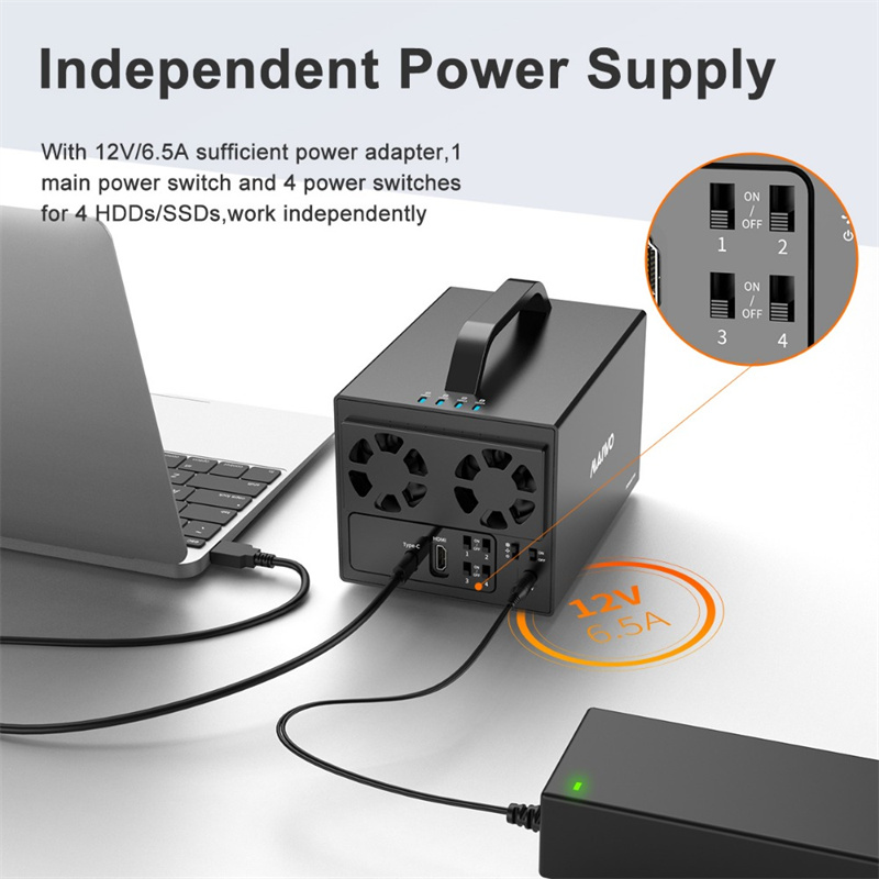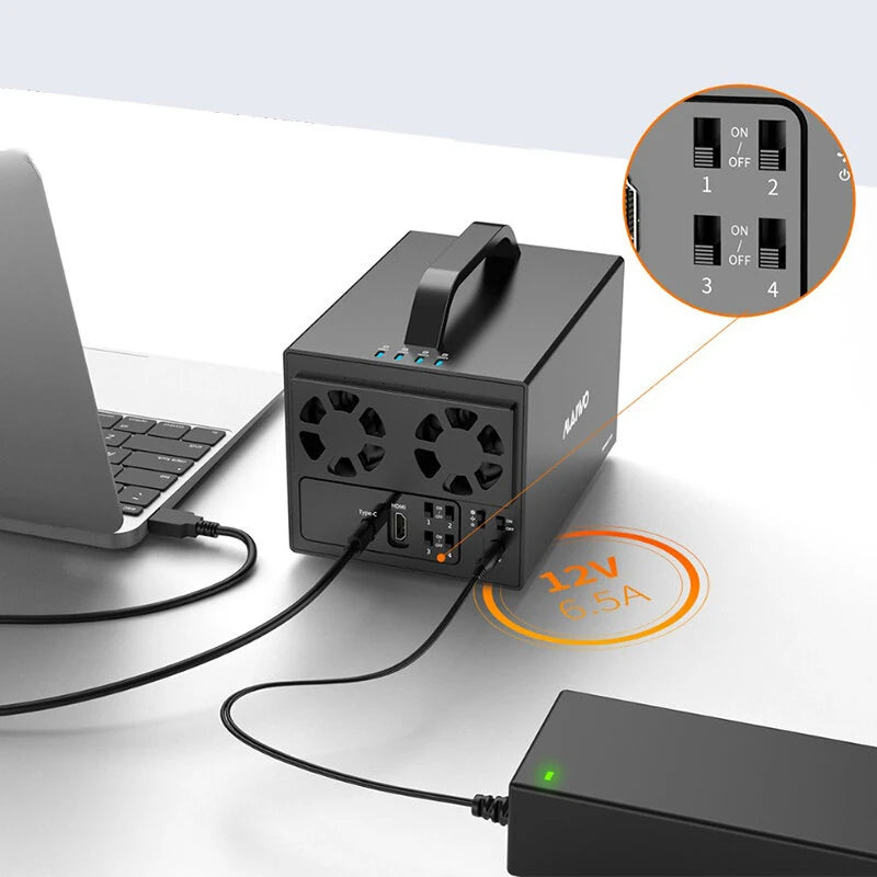 Power Supply: 12V/6.5A adapter with independent power switches for 4 drives