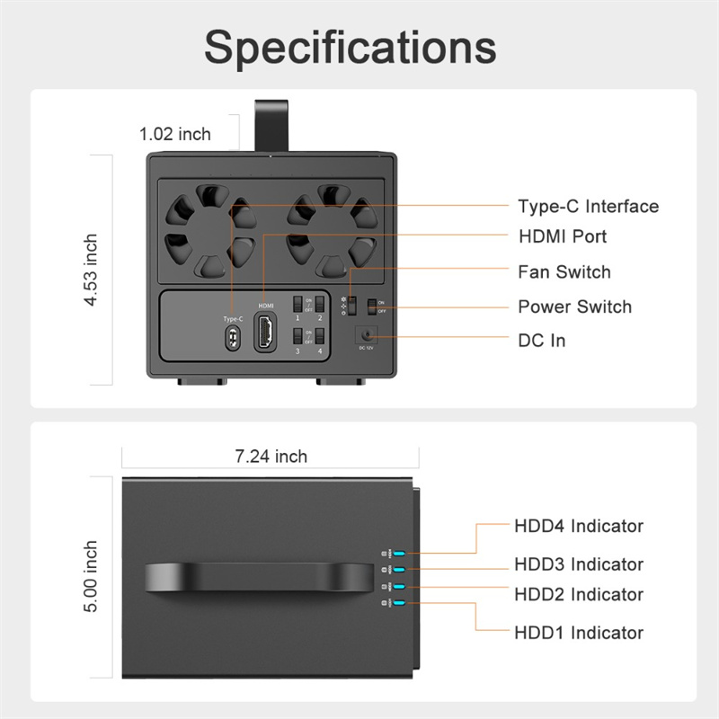 3. Independent Drive Management: Four independent power switches allow separate control for each HDD/SSD.