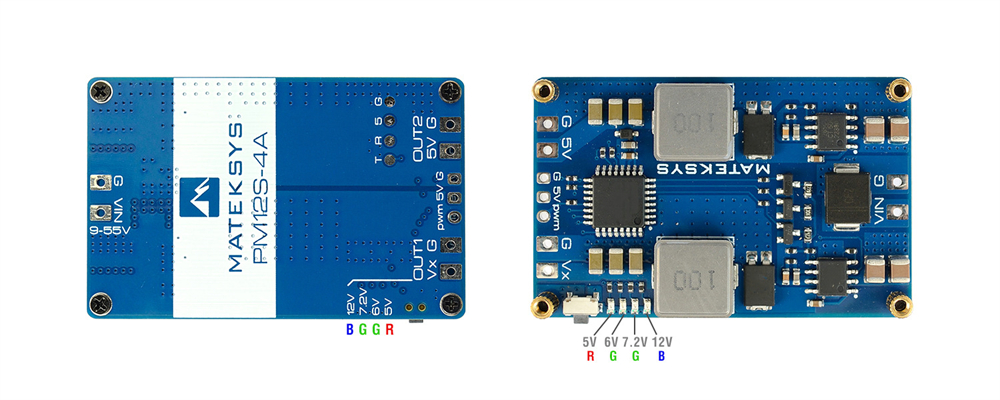 1. Set the OUT-1(Vx) voltageOutput voltage indicators, 5V Red, 6V Green, 7.2V Green, 12V BluePress and hold the button for 3 seconds to enter the setting of the OUT-1 voltage.The LED on the current output voltage will blink. then press button to choose the voltage between 5V(Red), 6V(Green), 7.2V(Green), 12V (Blue) .The value will be saved if no button action within 3 seconds.