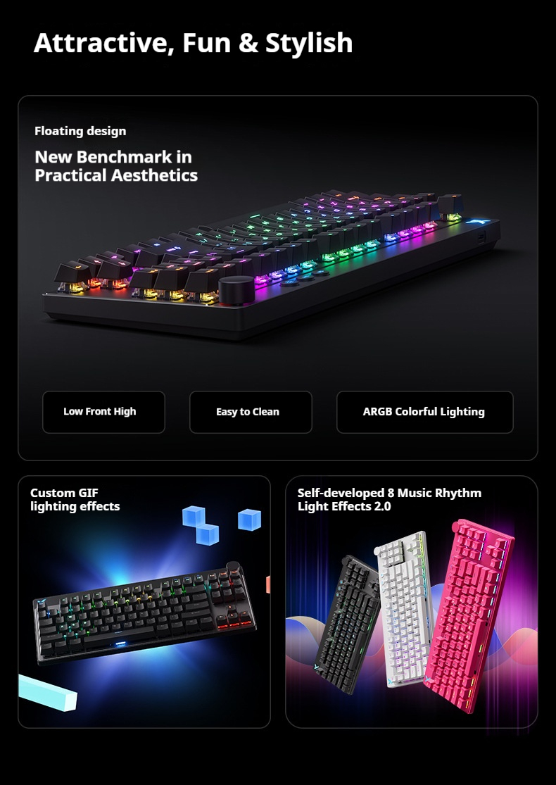 3. RGB Lighting: Includes customizable GIF effects and 8 dynamic music-lighting modes for immersive visuals.