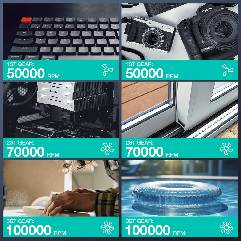 【Customizable Speed Settings】Our compressed air tool offers three adjustable speeds: low (50,000 RPM), medium (70,000 RPM), and high (100,000 RPM). Simply select the most suitable speed for your cleaning needs. The consistent airflow ensures your valuables remain unscathed.
