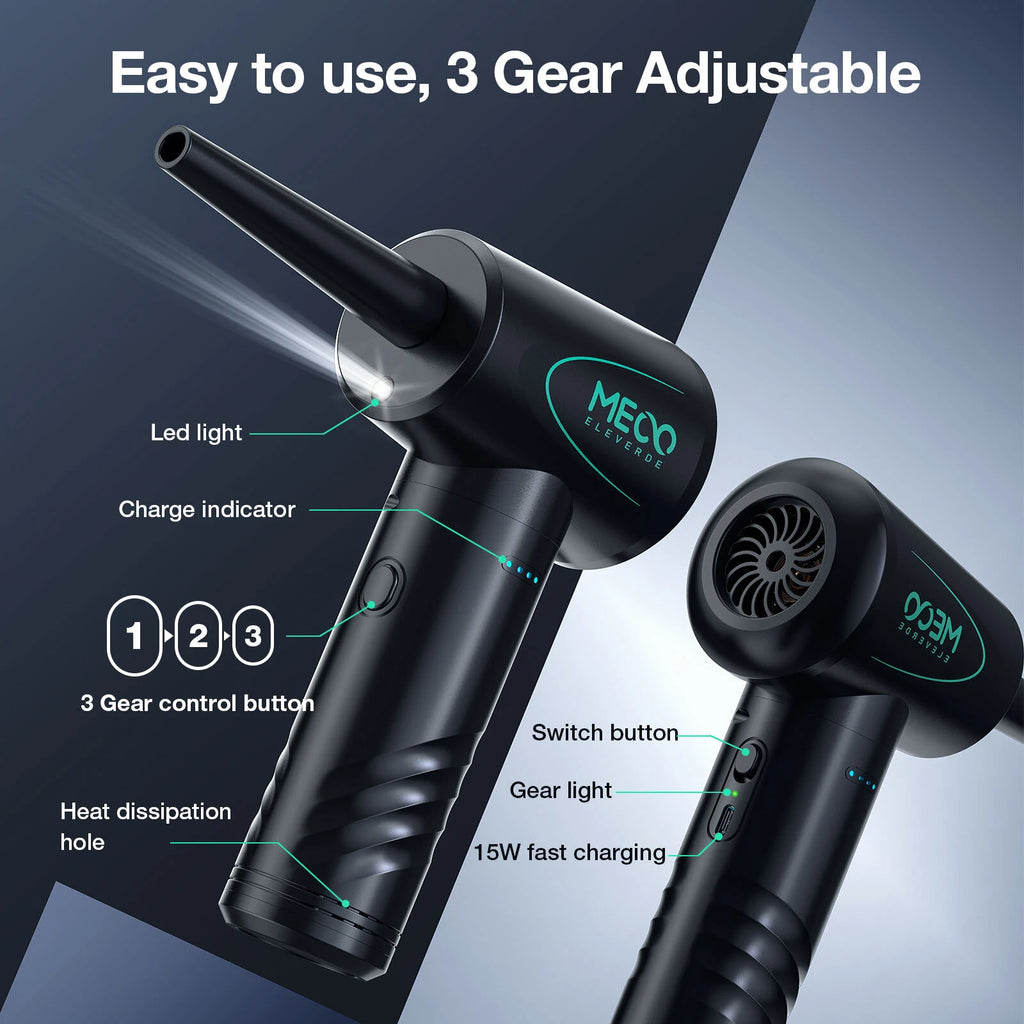 【Multi-functional Accessories & LED Light】MECO dust blower is furnished with an array of nozzles and a brush for enhanced cleaning, fitting various needs. The air duster allows easy cleaning in hard-to-reach areas. Built-in LED lights automatically brighten up as the device is switched on, illuminating dark corners, adding an extra layer of convenience to your cleaning routine.