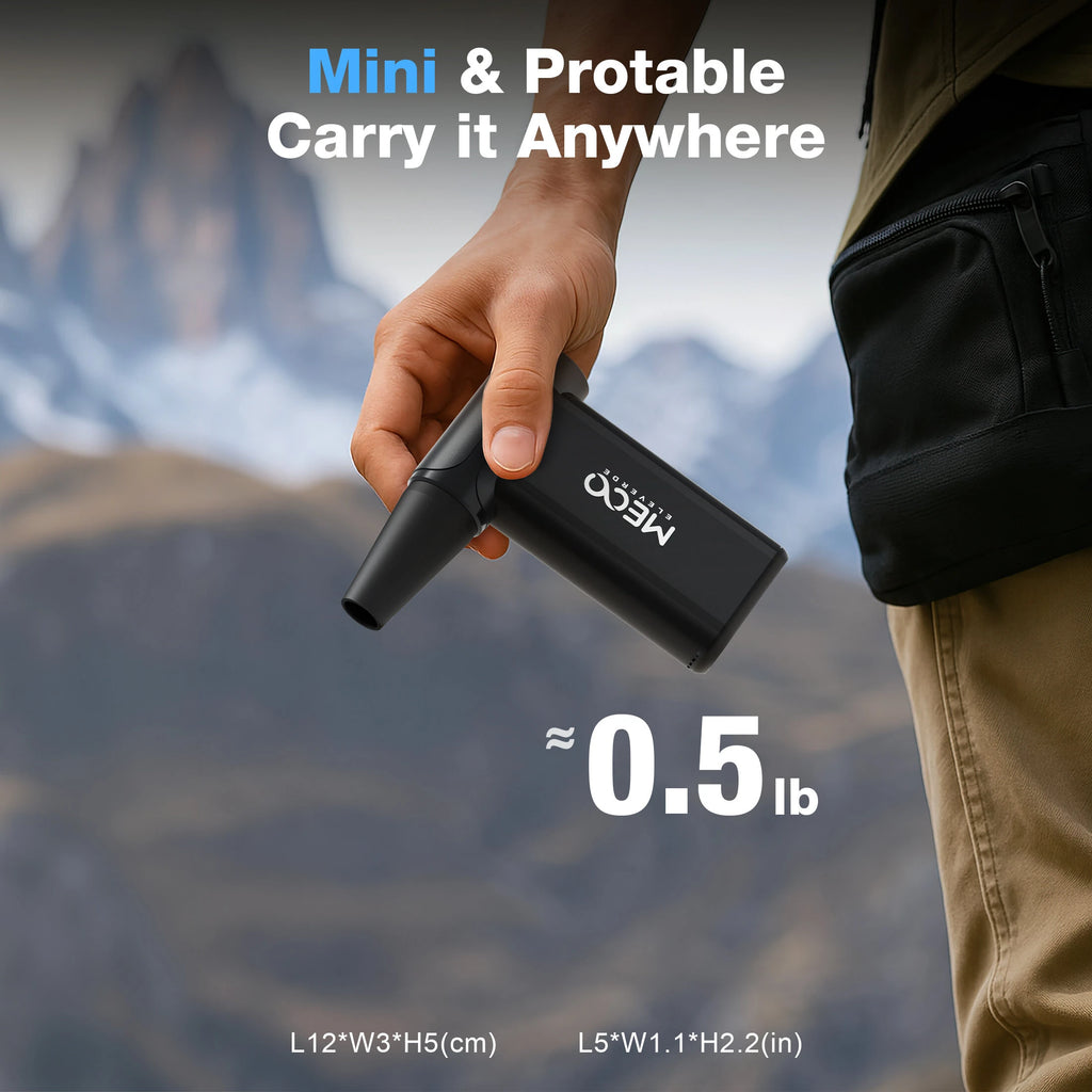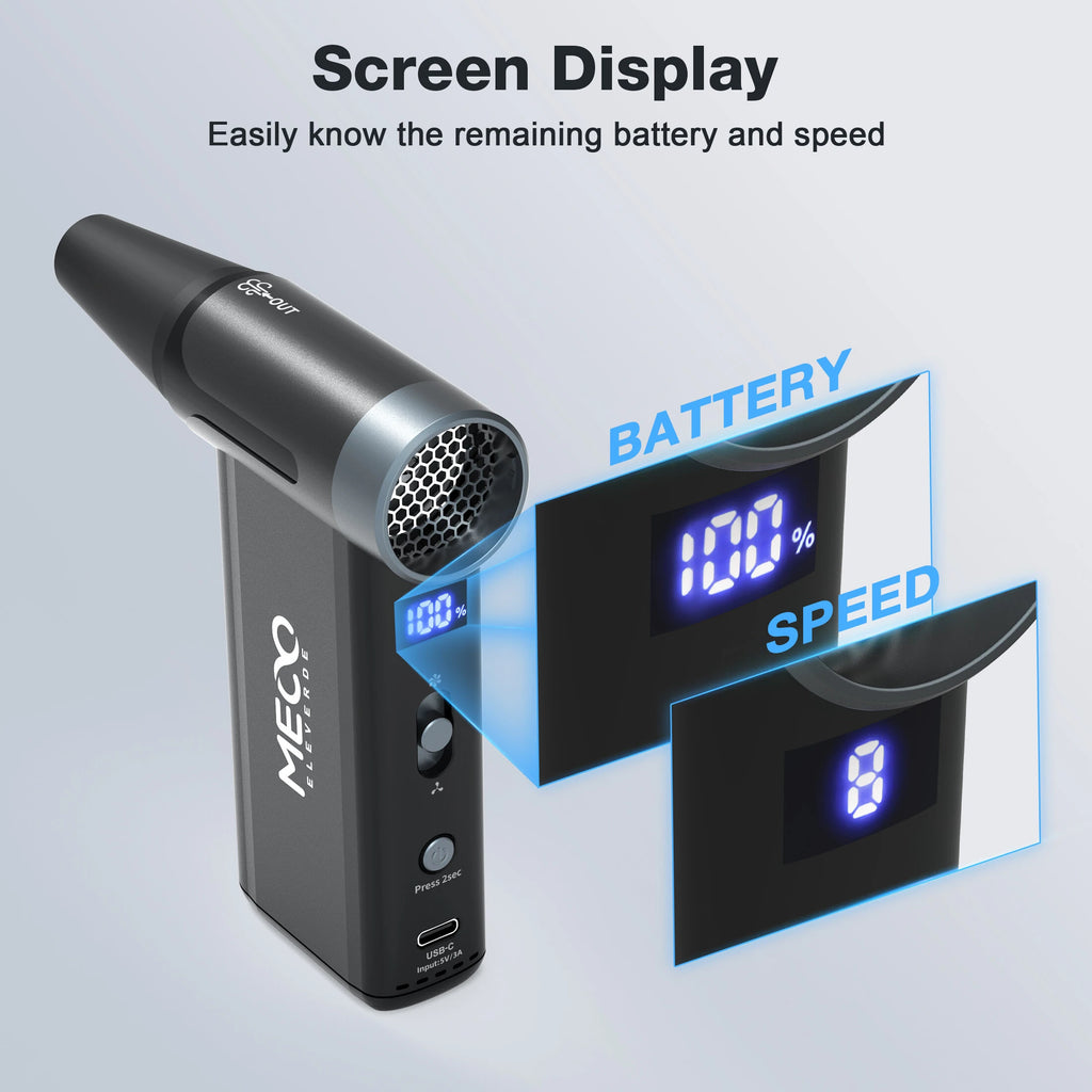 MECO D1 air duster turbo fan, perfect replacement for traditional dust off/spray x Compressed Gas Dusters! 8-level slide adjustable airflow, just aim and press a button to remove dust and debris from hard-to-reach crevices. Compressed air can clean electronics such as keyboards, computers, and camera lenses, keeping your tech gear in pristine condition. MECO Dusters also remove dust from areas around the home, including window blinds, collectibles, sewing machines, decorations, and woodworking materials. It can even be used for inflating items such as air mattresses and swimming rings, as well as for picnics, starting fires, and clearing car and yard leaves. 4000 mAH battery and battery level display, eliminate battery anxiety(Usage time of 1-8 gears :30-10min). MECO compressed air duster is only 5*1*2.2 inches and 0.5 lb, making it extremely easy to carry. Ideal choice for efficient cleaning: No frost damage to electronic equipment like aerosol dusters. Free of harmful gases for safe operation. Environmentally friendly and money-saving, no need to repeatedly purchase a spray can of air.