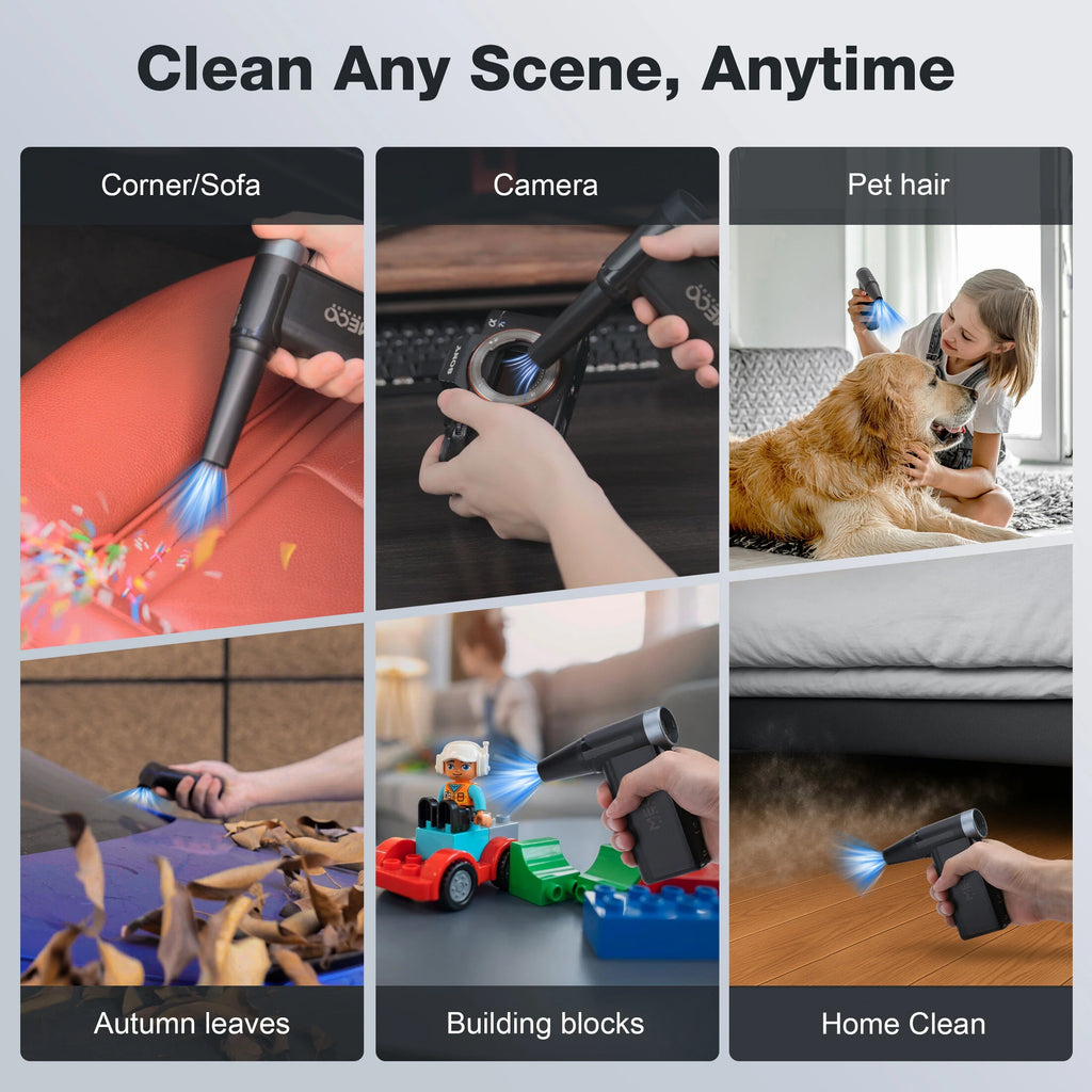 1. 150,000 RPM Industry-Leading Power: Cordless Compressed air duster features a brushless motor, delivers 50%+ higher speed than average blowers, blasting away stubborn dust from keyboards, car vents, and workshop tools.