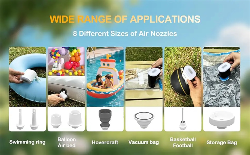 4.【Versatile Air Nozzles】- equipped with 8 air nozzles, applicable to most small and large inflating products, such as balloons, football, basketball, air cushion beds, swimming pool floats, sleeping mats, swimming rings, inflatable furniture, swimming pool toys and storage compression bags, vacuum fresh-keeping bags, .