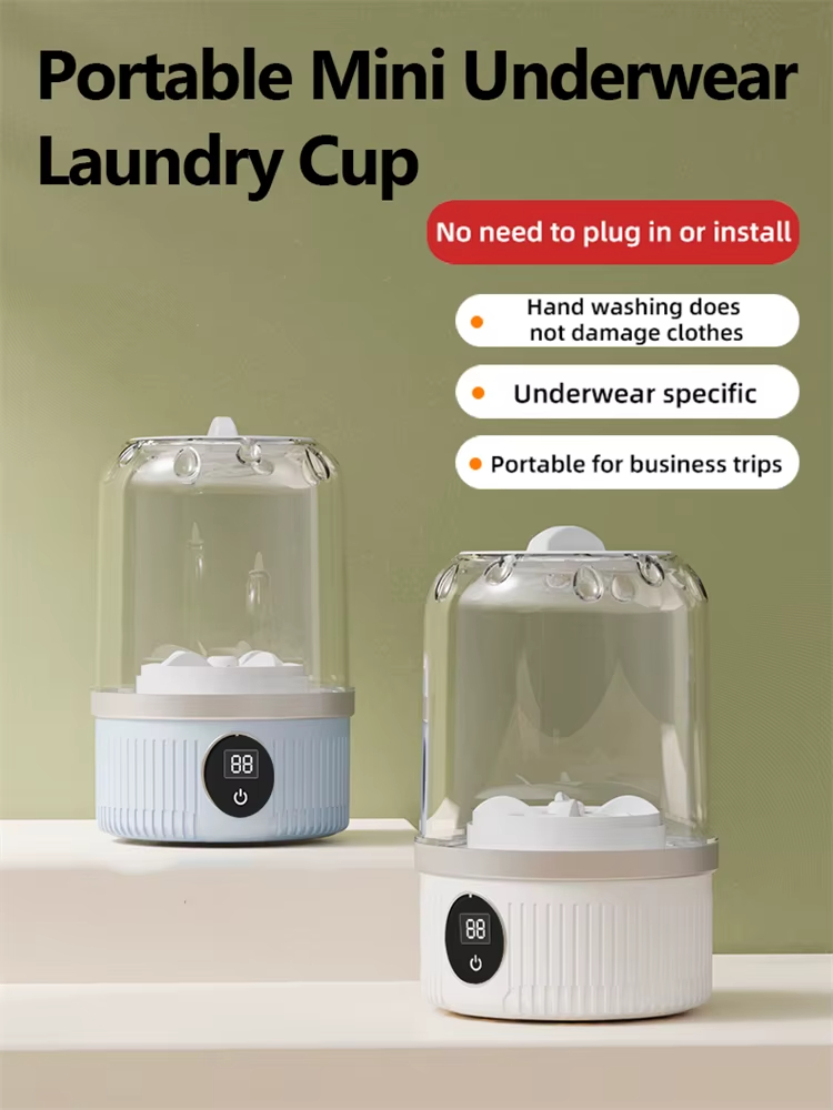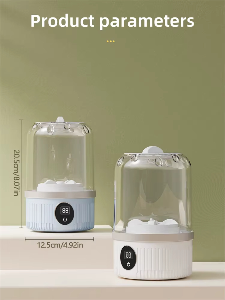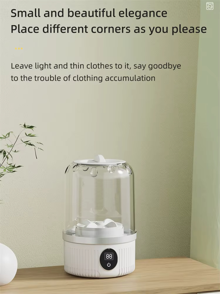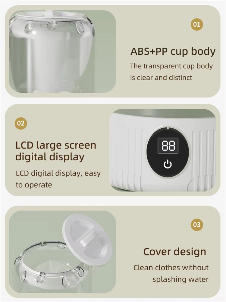 - Transparent Cup Body with Safety Lid: The machine's transparent ABS+PP cup design allows users to monitor washing progress easily, while the secure lid prevents water splash, ensuring a clean washing process. The clear, distinct cup body also adds aesthetic appeal, making it a stylish addition to any laundry setup.