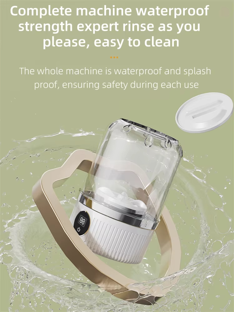 - Complete Machine Waterproof and Splashproof Design: The wireless charging mini washing machine boasts a robust waterproof design, making it suitable for varied environments including bathrooms and outdoor usage on trips. This feature ensures ease of cleaning and safety during operation, preventing water from damaging the internal components.