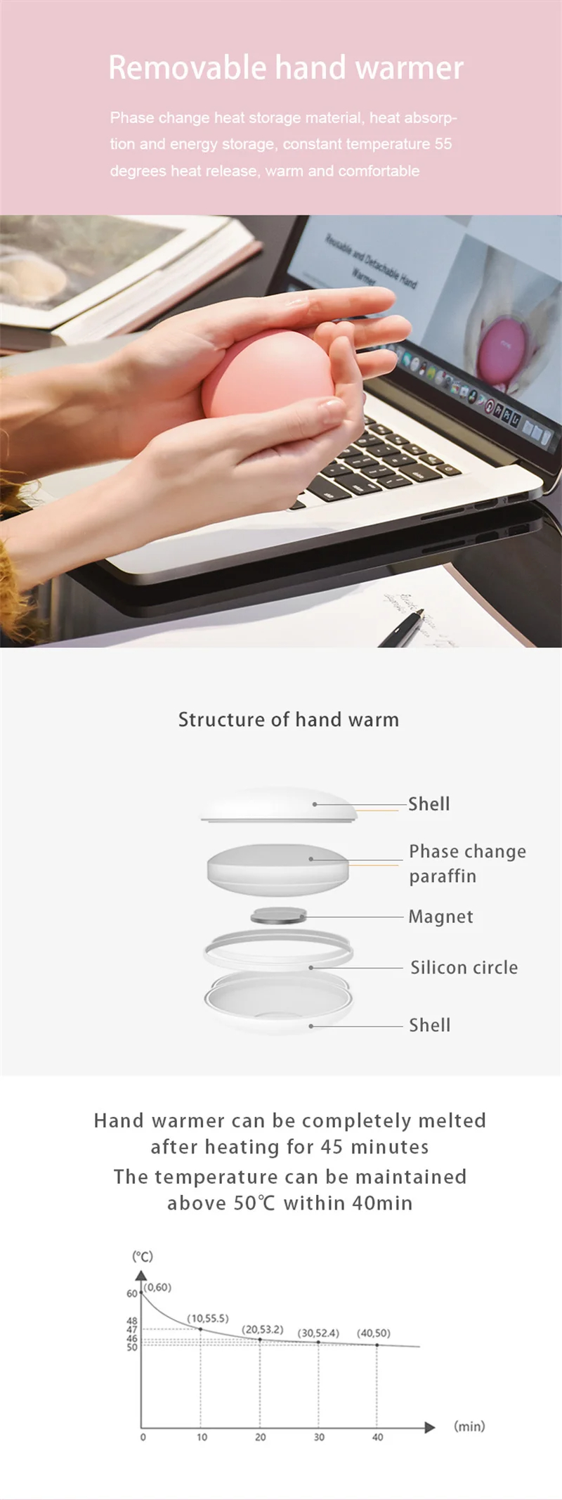 - Portable Hand Warmer: The detachable hand warmer adds an extra layer of convenience. Made from phase-change thermal material, it can absorb and store heat, maintaining a constant 55 degrees Celsius to keep your hands warm on the go, making it ideal for both home and outdoor use.