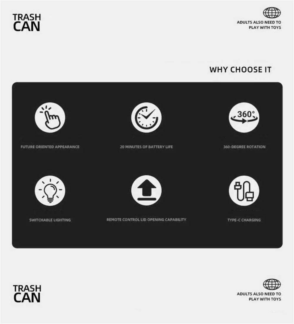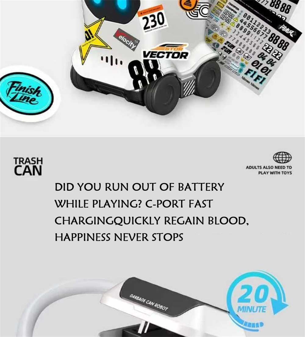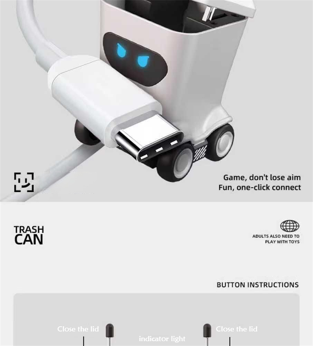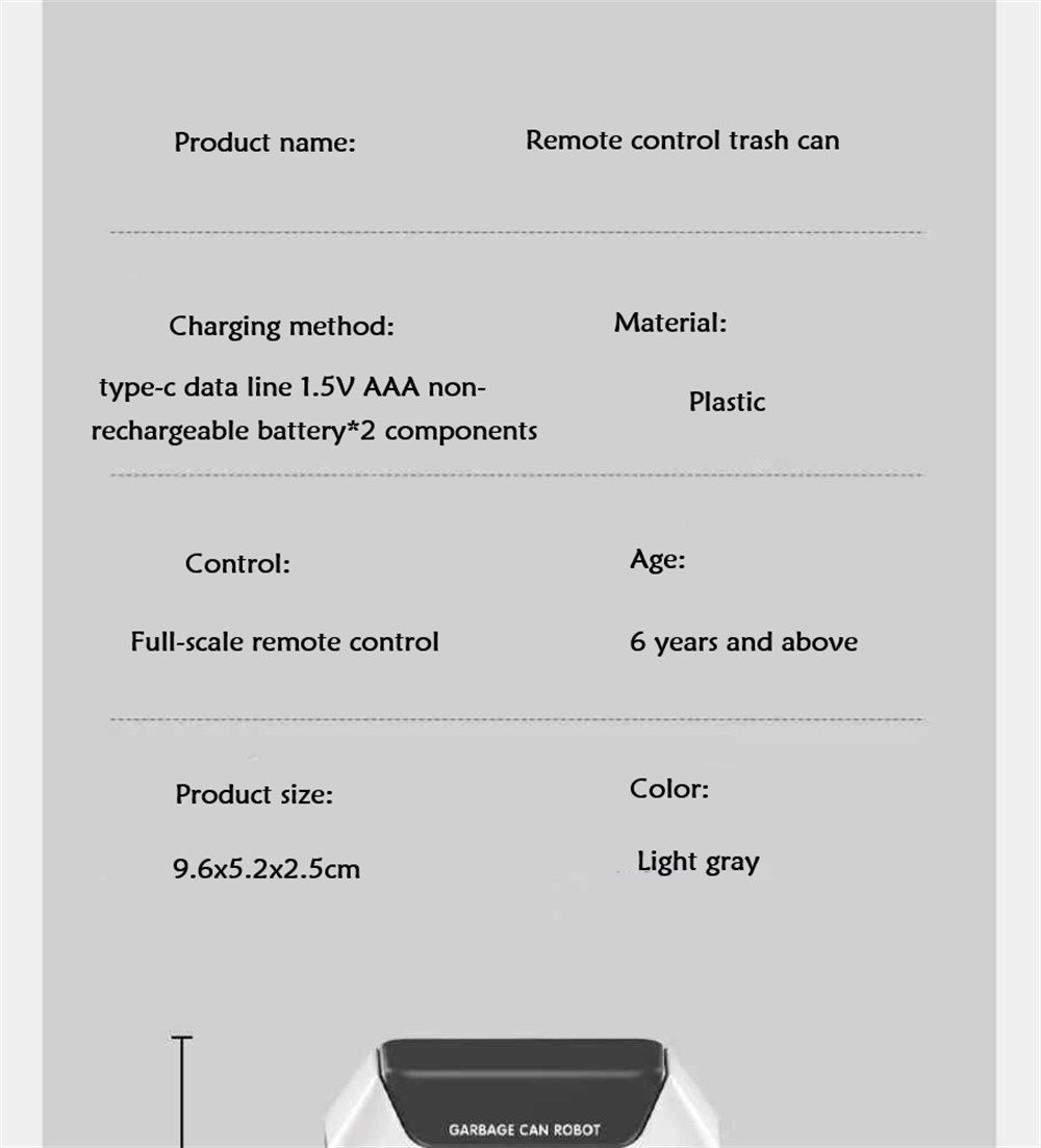 Battery for the Trash Can:3.7V 200mAh Li-ion battery(included) Battery Charging Time:About 1 hours Battery Using Time:About 20 minutes |