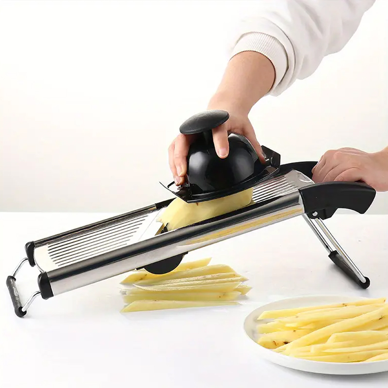 - Precision Adjustable Slices: Our vegetable slicer features an innovative adjustable blade system, enabling you to select precise slice thickness from 3 to 9 mm or filament thickness at 4.5 mm and 9 mm. This versatility makes it perfect for crafting French fries, potato chips, and healthy fruit and vegetable salads with minimal effort.