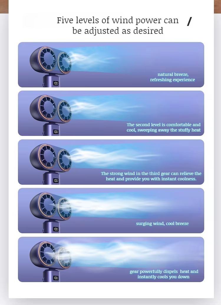 - Five Adjustable Wind Speeds: Tailor your cooling experience with five distinct wind speeds, ranging from a gentle wind to powerful airflow. Whether you're indoors, outdoors, or on-the-go, this fan satisfies varying cooling needs.
