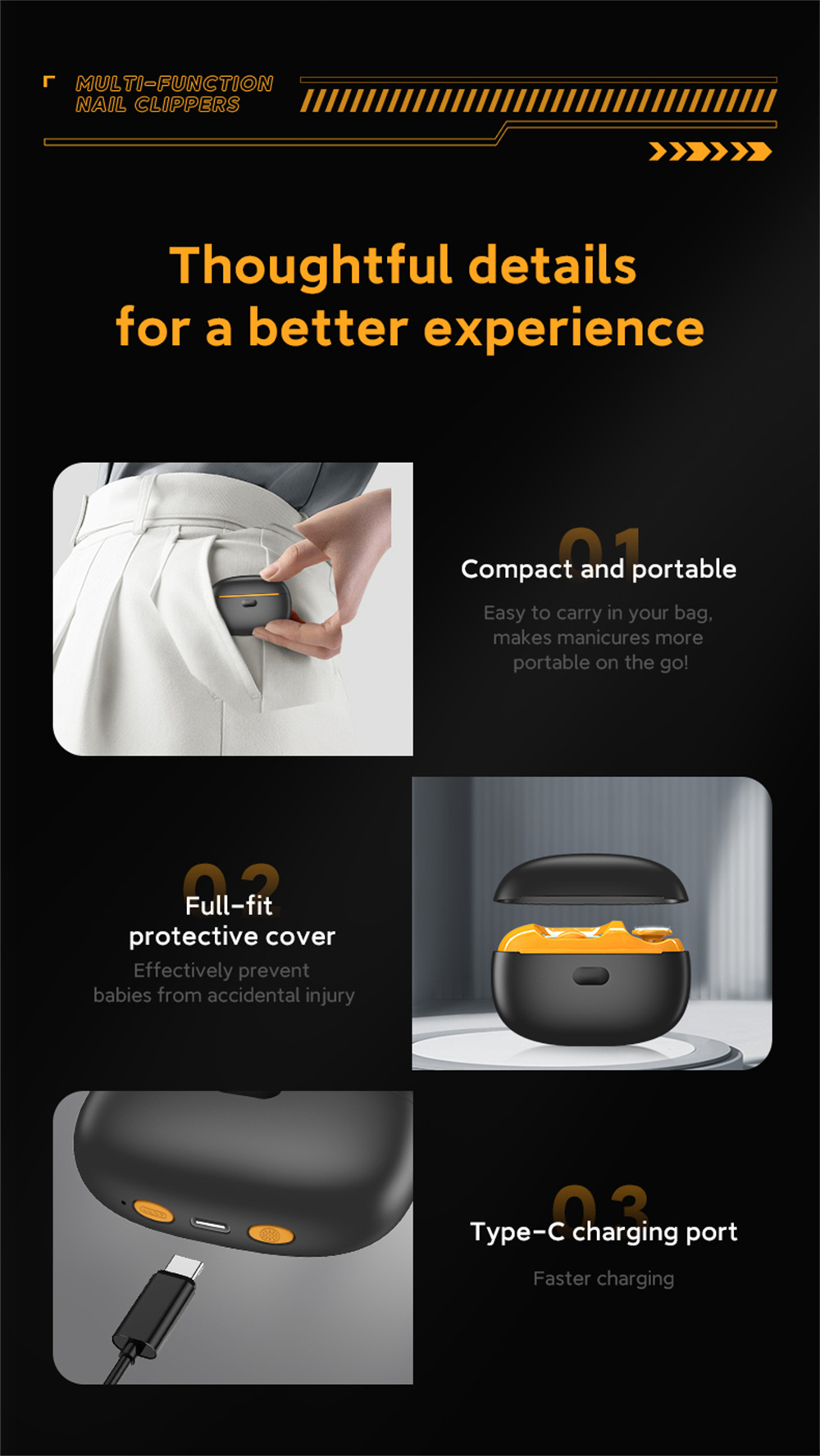 - Easy Cleanup and Portability: Features a rear storage design to collect nails clippings, preventing mess and maintaining tidiness in public spaces, while its small size and light weight making it highly portable for travel use.