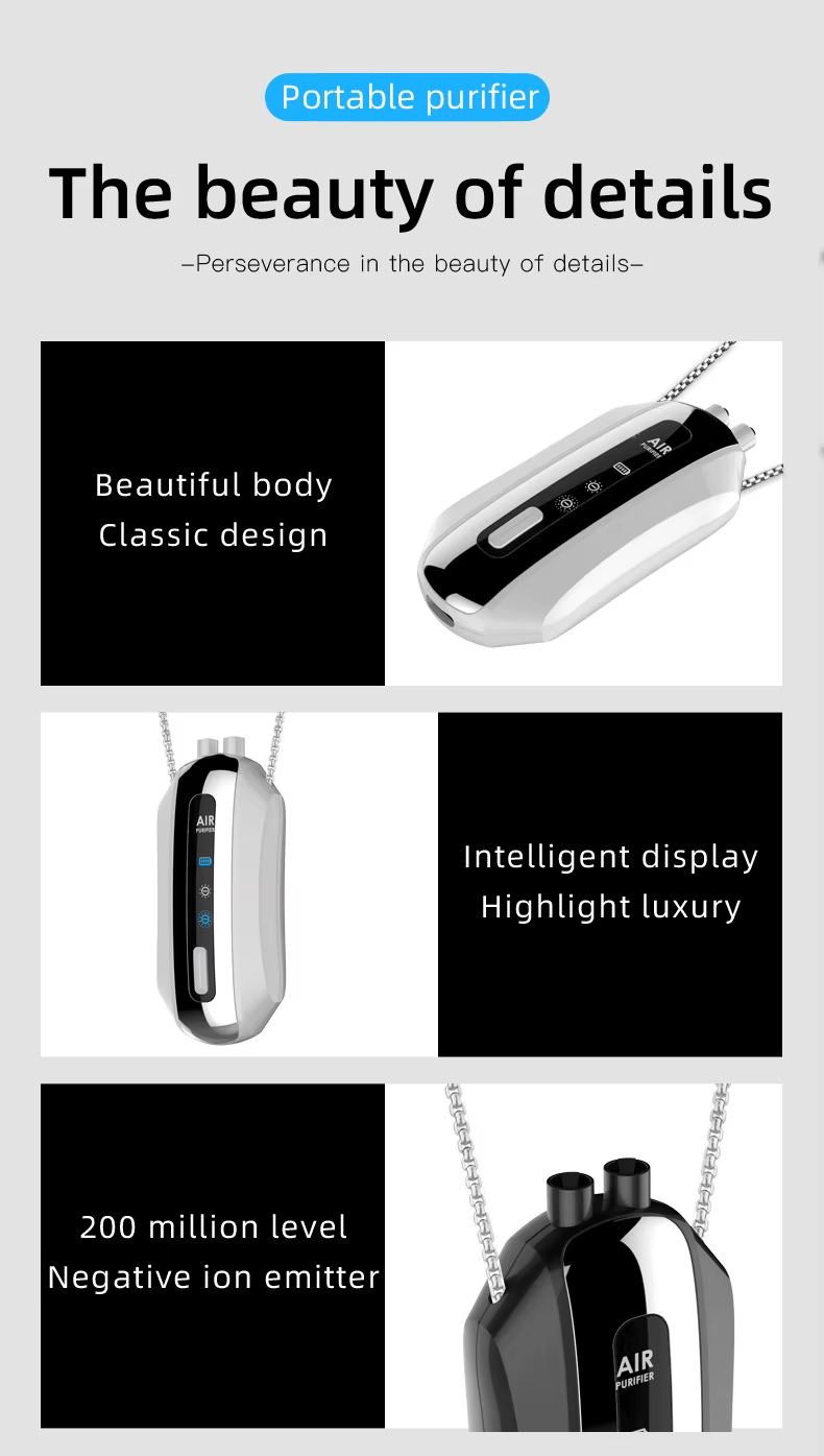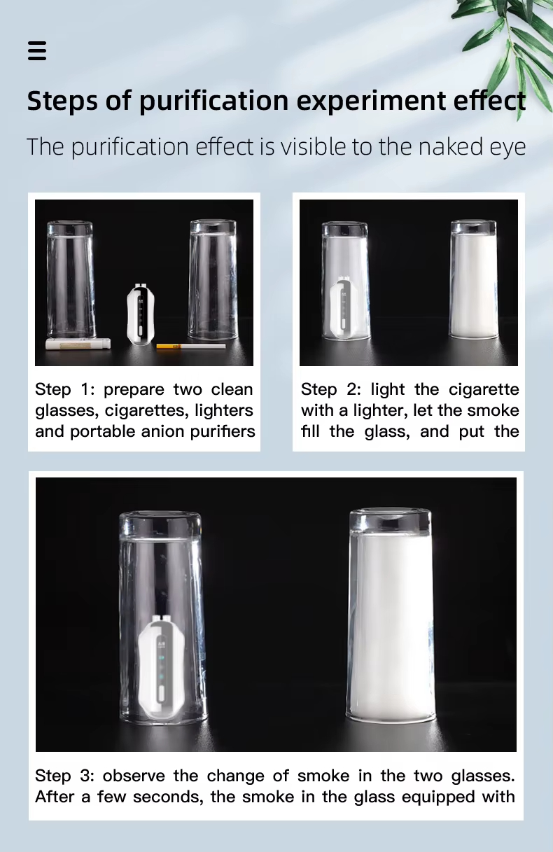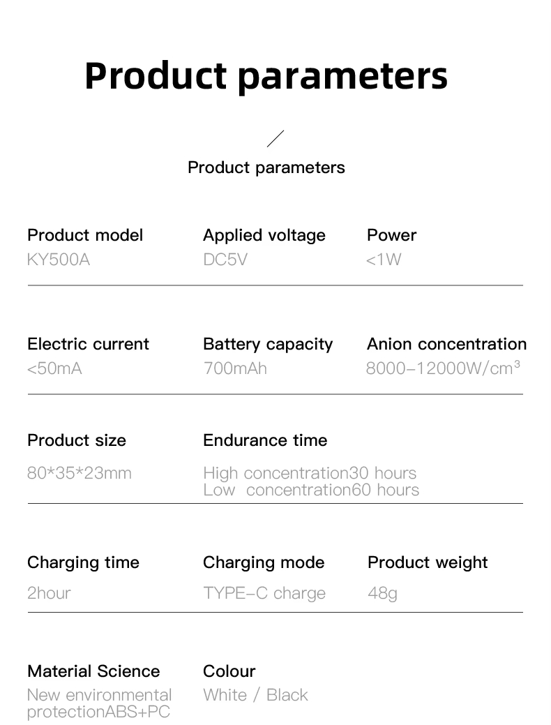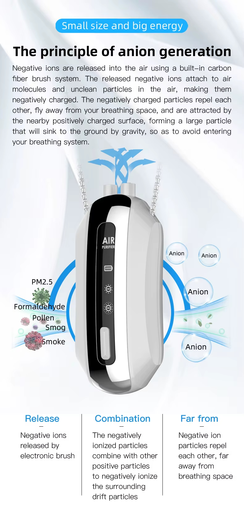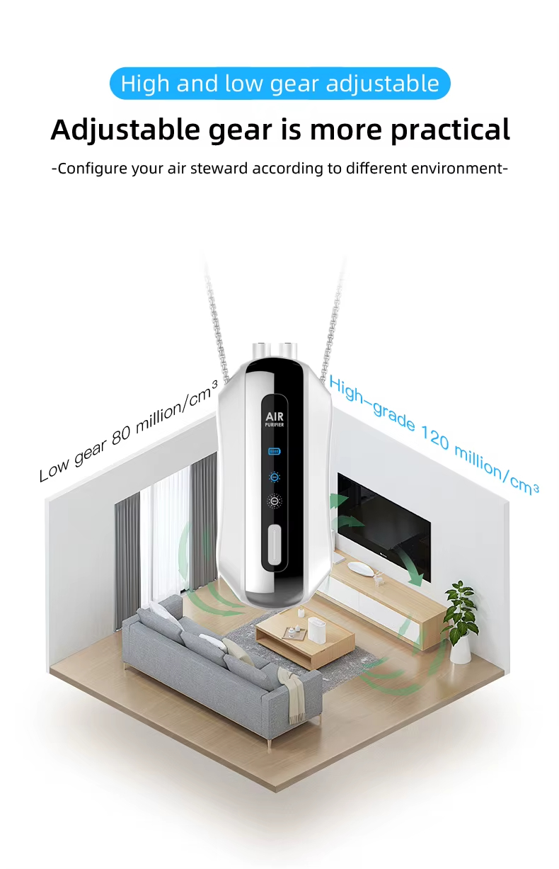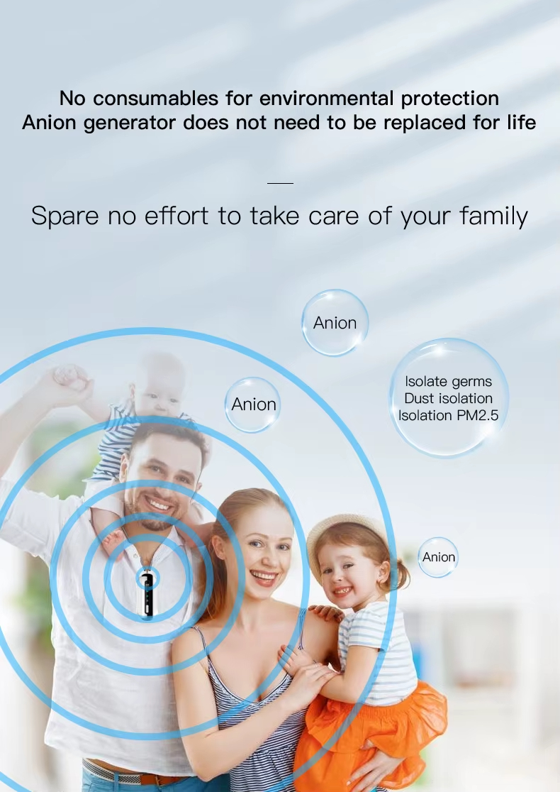 Generates up to 120 million negative ions per cm³, effectively eliminating PM2.5, dust, harmful substances and bacteria from the air around you, ensuring a cleaner and healthier environment.