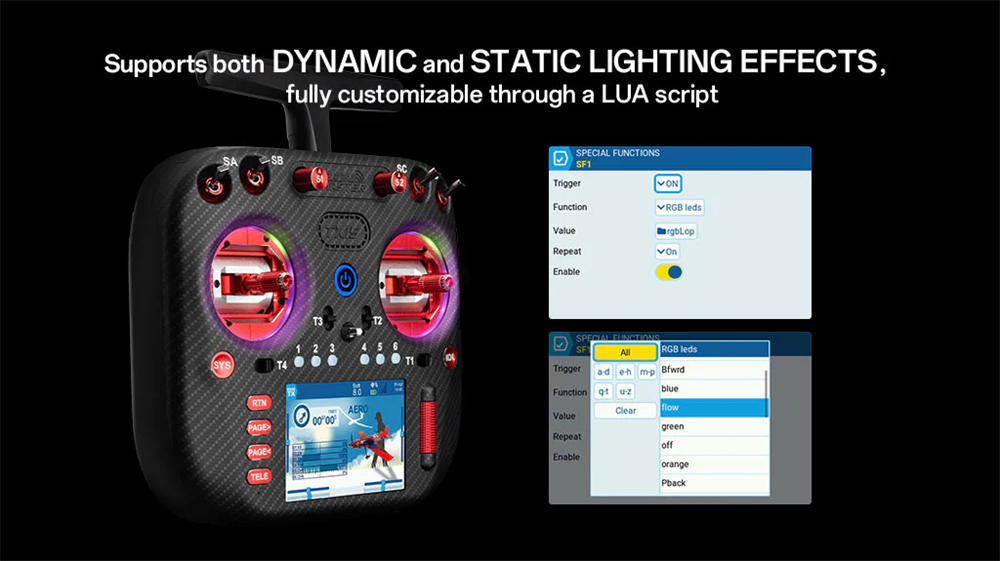 Programmable RGB LED rings designed for AG02 gimbals. Add color and visual flair to your gimbals through a LUA script supporting both dynamic and static lighting effects. Make your radio standout from the crowd.
