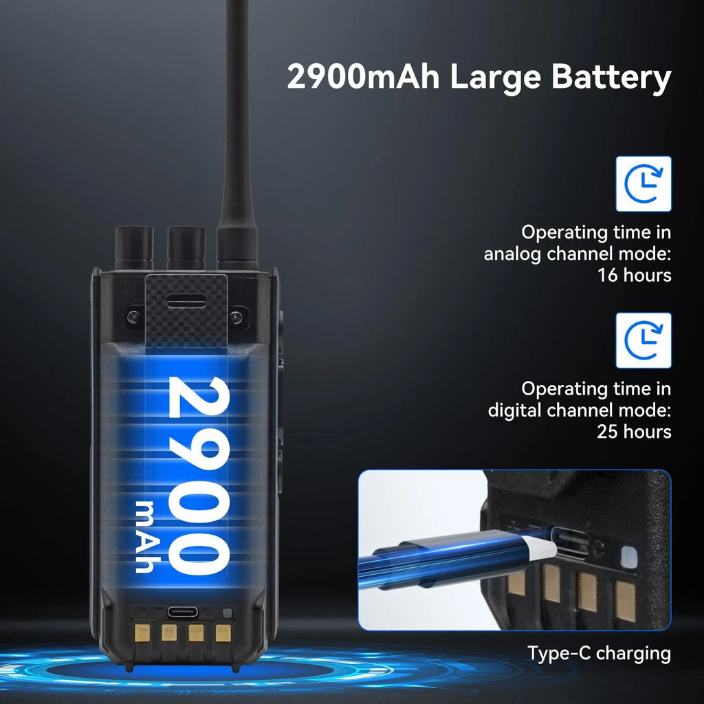 5. 2900mAh rechargeable battery: makes walkie talkies effective to use the whole day outdoors; Type-C charging; desktop charger; offers flexible charging options.