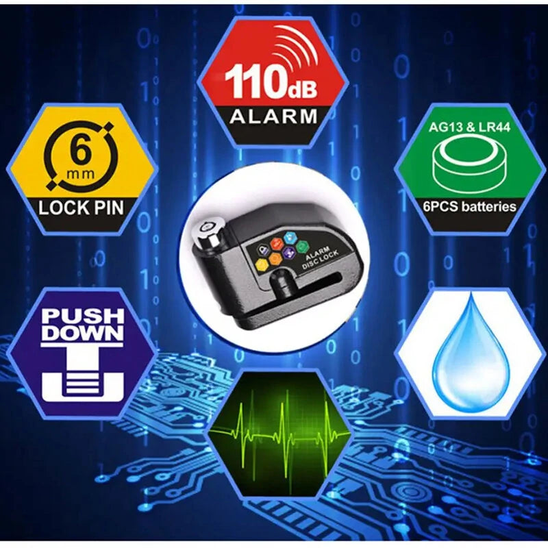 1.【ANTI-THEFT ALARM】 - disc brake lock protects your beloved motorcycle bike from theft when you park at home or outdoors, with a sound of up to 110dB. Sensitive motion vibration sensors activate an alarm when vibrating to scare thieves away from your belongings.
