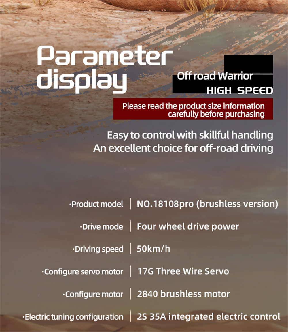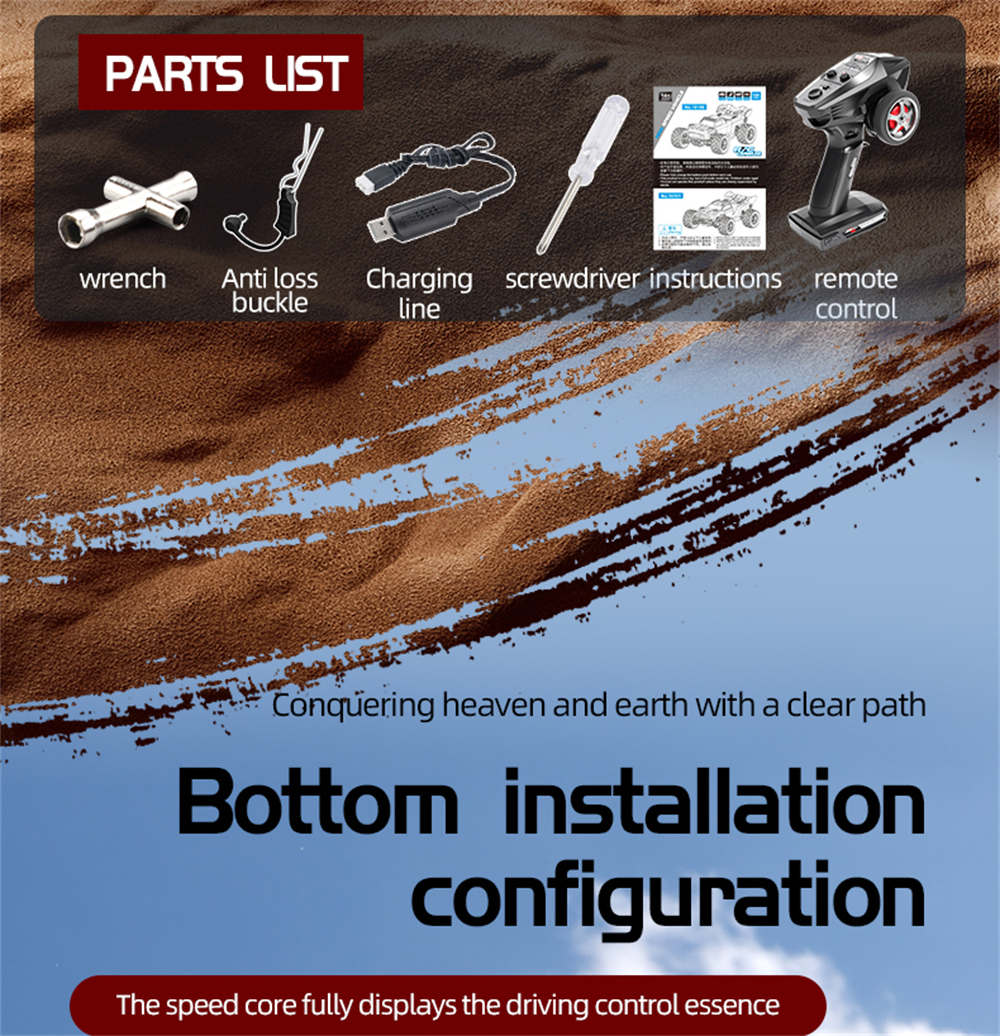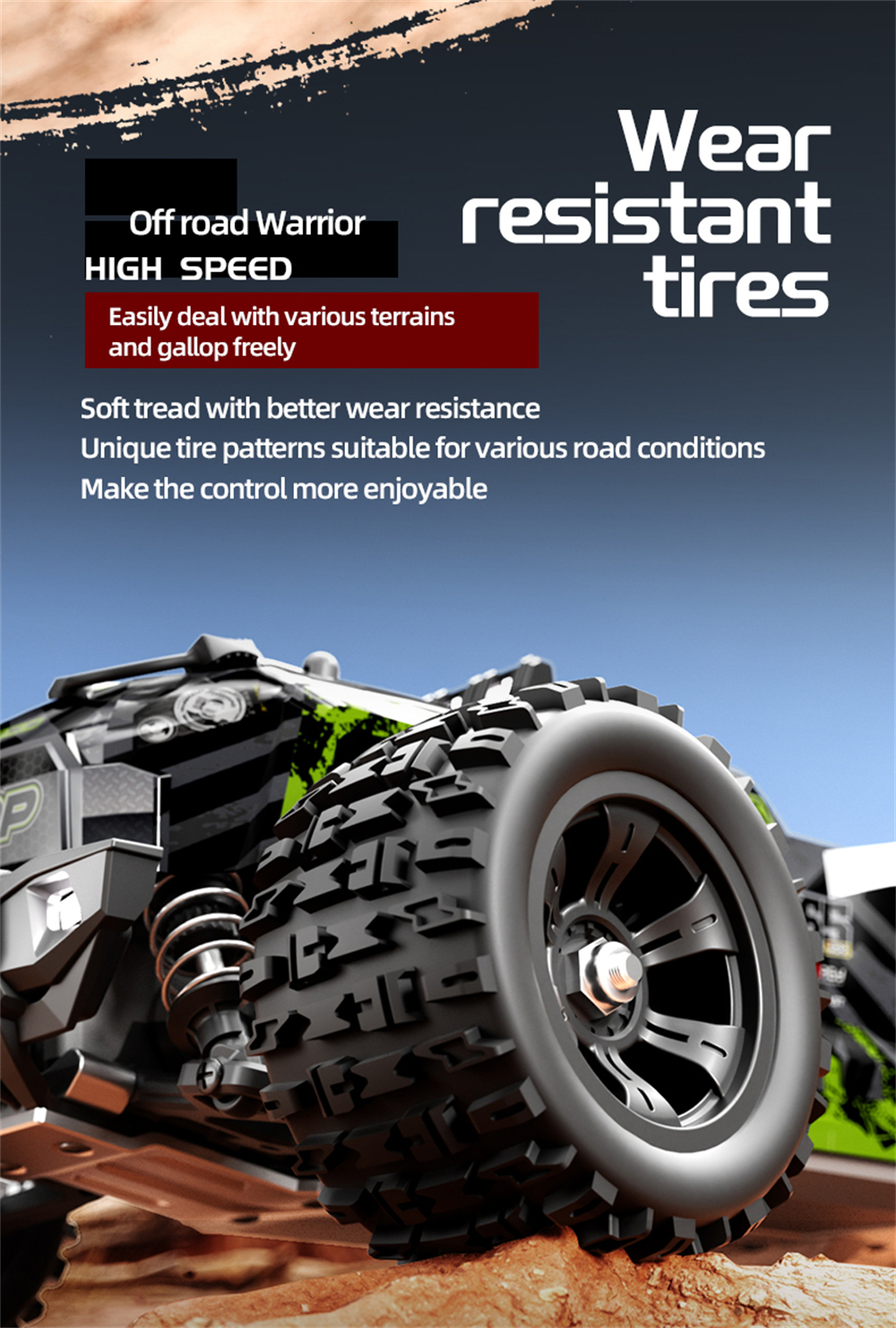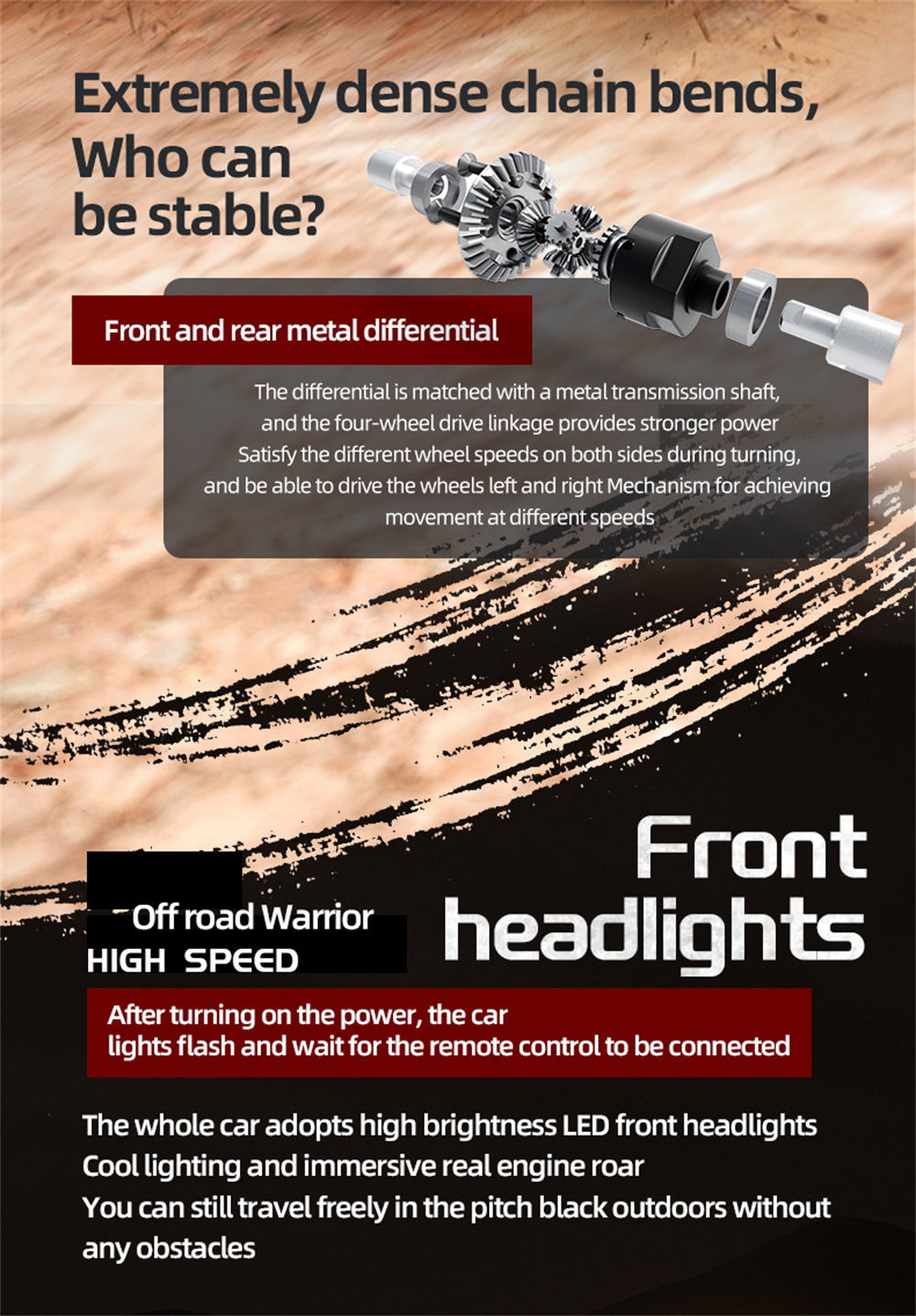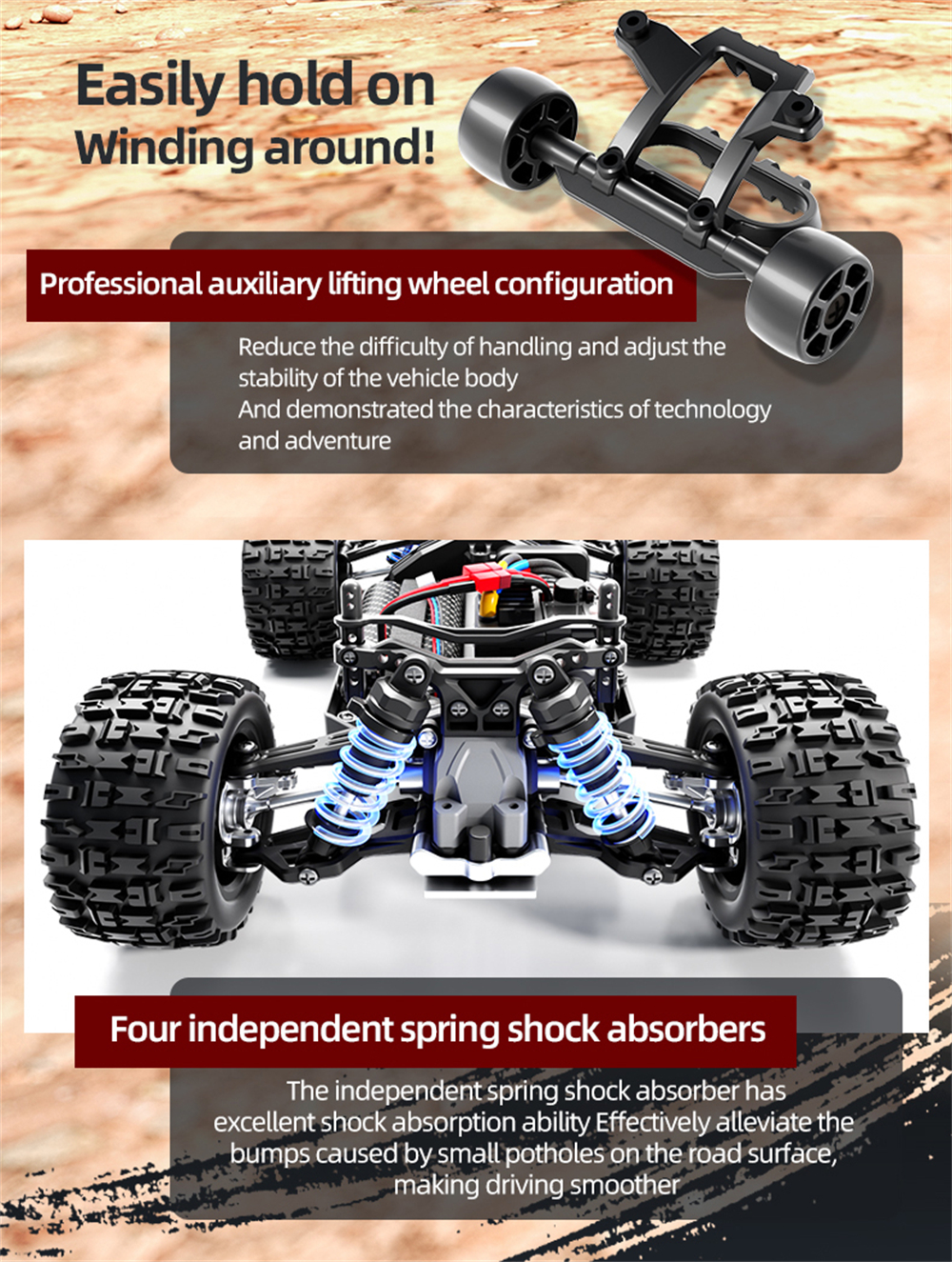 1. It adopts simulation structure design, has the control feeling of real car, realizes full-proportional stepless speed change, high-speed driving, sudden acceleration, deceleration, braking, reversing, left turn, right turn;2. Applicable sites: flat land, sand, mud, grass.3. Four-wheel drive: front and rear upright spring shock absorber, double wishbone independent suspension system;4. Remote control system: 2.4G full-proportional synchronous remote control system. Full-proportional throttle/steering;5. Electric adjustment: 2.4G splash-proof four-way 35A integrated electric adjustment/receiver;6. Drive shaft structure: front wheel cross ball head universal joint drive shaft, rear wheel split dog bone drive shaft;7. Servo parameters: three-wire 17G servo;8. Battery parameters: 7.4V, 18650-1500mAh Li-ion battery (T plug);9. Ball bearings: The whole car uses 15 ball bearings;10. Metal parts: metal underbody reinforcement plate, metal differential, metal gear, metal steering knuckle, metal front and rear arm bracket, metal middle drive shaft;11. Car shell: The car shell uses high-toughness explosion-proof PVC car shell; the car shell comes with anti-lost silicone buckle;12. Lighting: Equipped with LED headlights and front top lights; (three gear modes: always on, slow flash, fast flash);13. Other equipment: equipped with head-up wheels;14. Simulated big tires with strong grip;