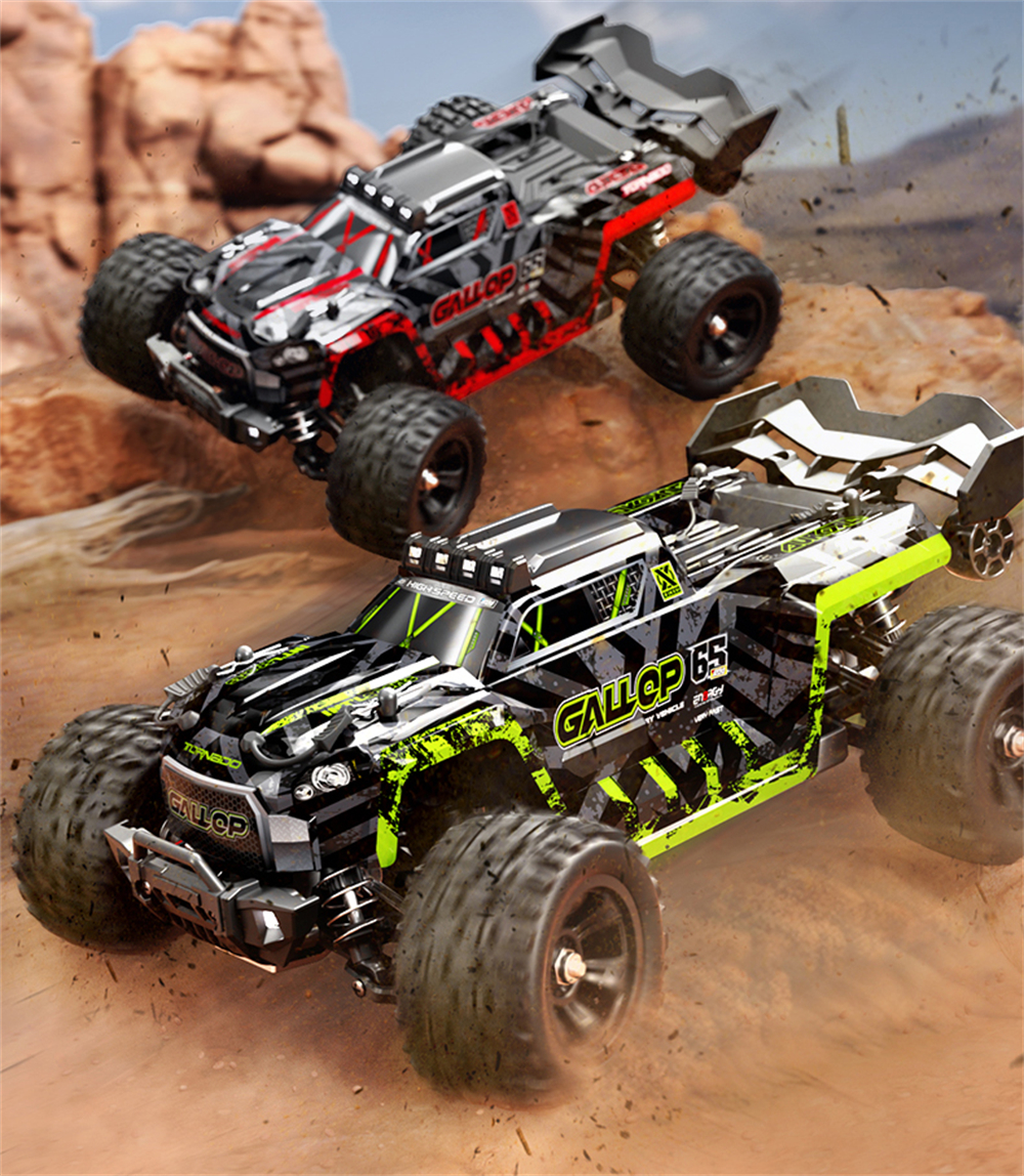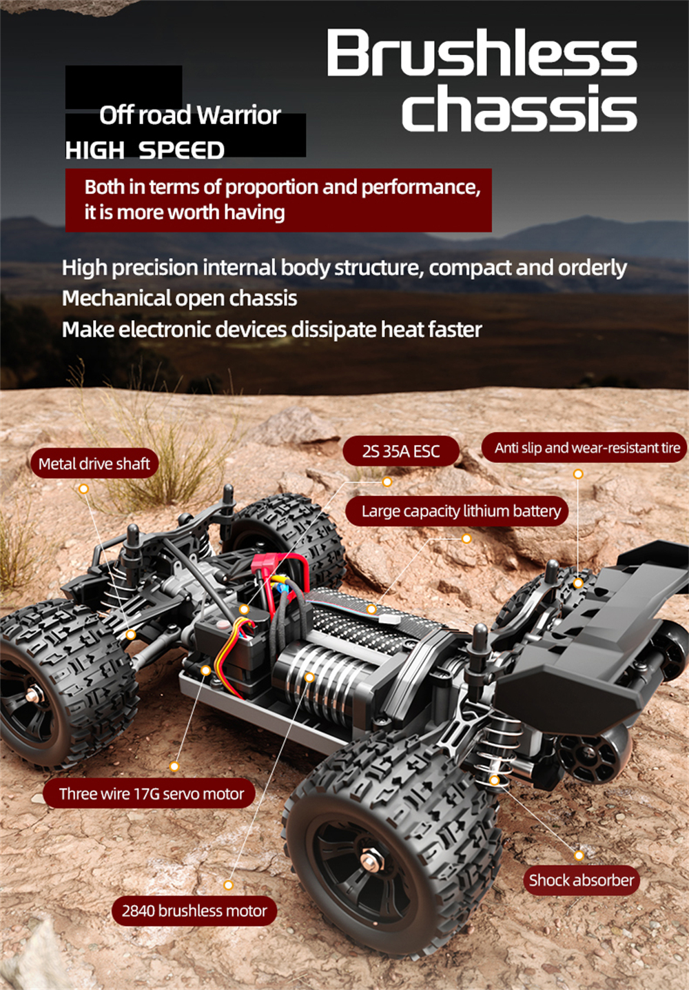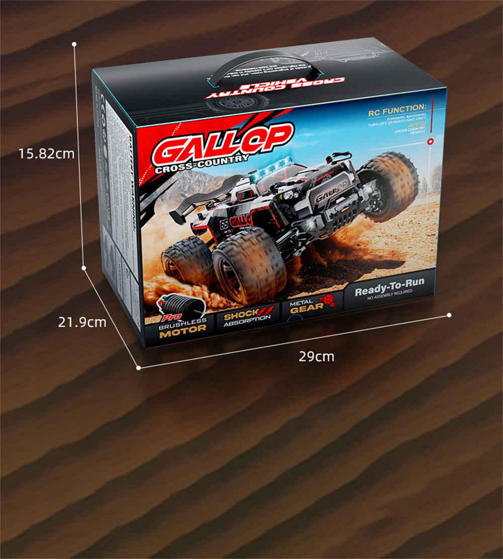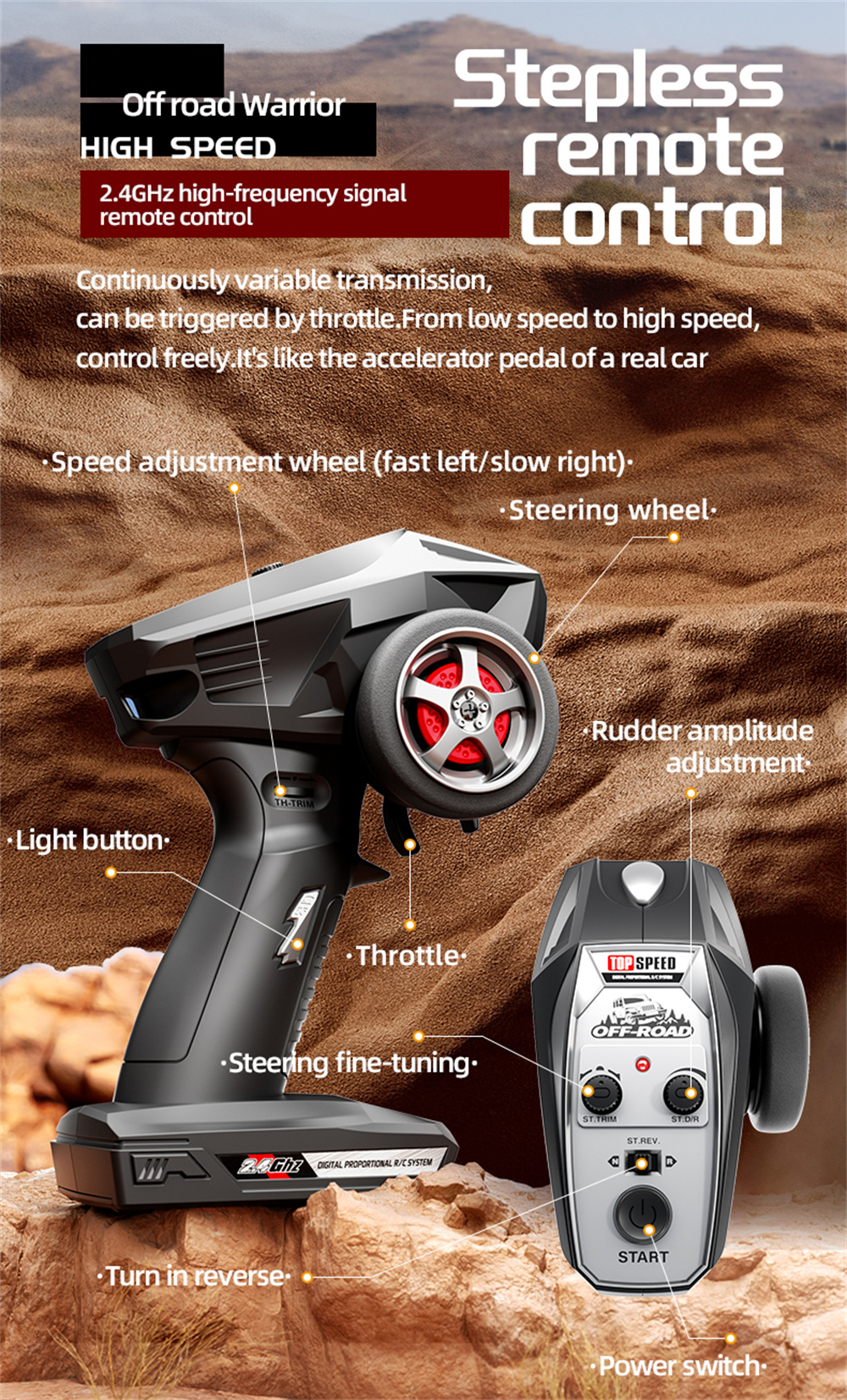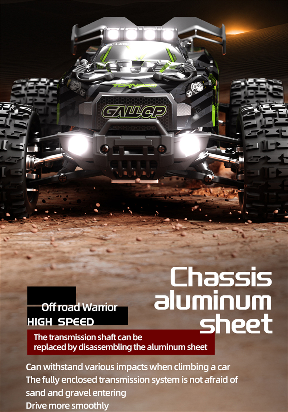 1. It adopts simulation structure design, has the control feeling of real car, realizes full-proportional stepless speed change, high-speed driving, sudden acceleration, deceleration, braking, reversing, left turn, right turn;2. Applicable sites: flat land, sand, mud, grass.3. Four-wheel drive: front and rear upright spring shock absorber, double wishbone independent suspension system;4. Remote control system: 2.4G full-proportional synchronous remote control system. Full-proportional throttle/steering;5. Electric adjustment: 2.4G splash-proof four-way 35A integrated electric adjustment/receiver;6. Drive shaft structure: front wheel cross ball head universal joint drive shaft, rear wheel split dog bone drive shaft;7. Servo parameters: three-wire 17G servo;8. Battery parameters: 7.4V, 18650-1500mAh Li-ion battery (T plug);9. Ball bearings: The whole car uses 15 ball bearings;10. Metal parts: metal underbody reinforcement plate, metal differential, metal gear, metal steering knuckle, metal front and rear arm bracket, metal middle drive shaft;11. Car shell: The car shell uses high-toughness explosion-proof PVC car shell; the car shell comes with anti-lost silicone buckle;12. Lighting: Equipped with LED headlights and front top lights; (three gear modes: always on, slow flash, fast flash);13. Other equipment: equipped with head-up wheels;14. Simulated big tires with strong grip;