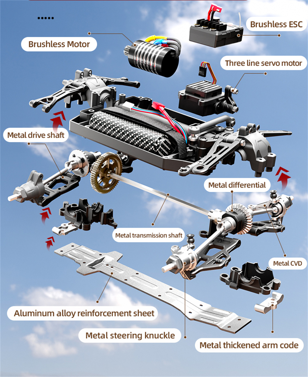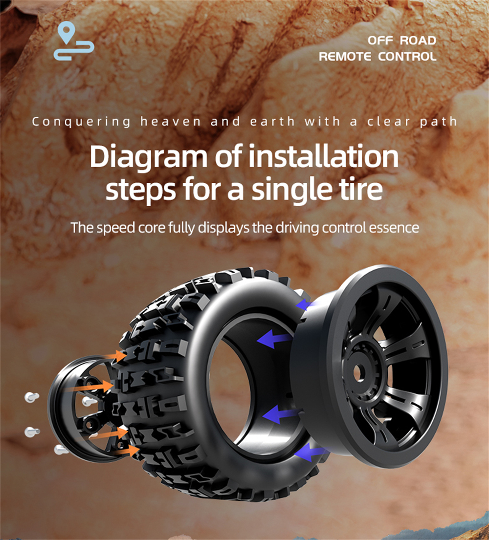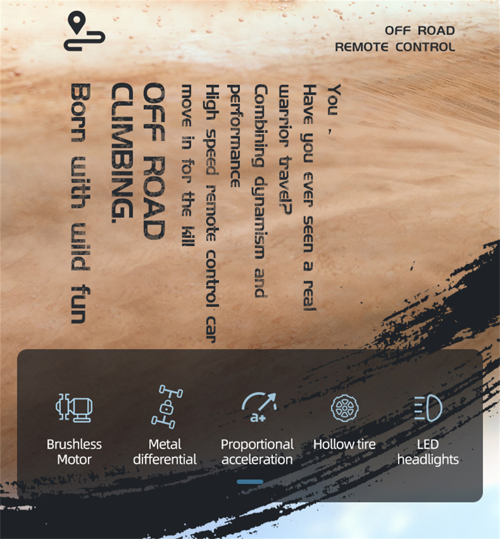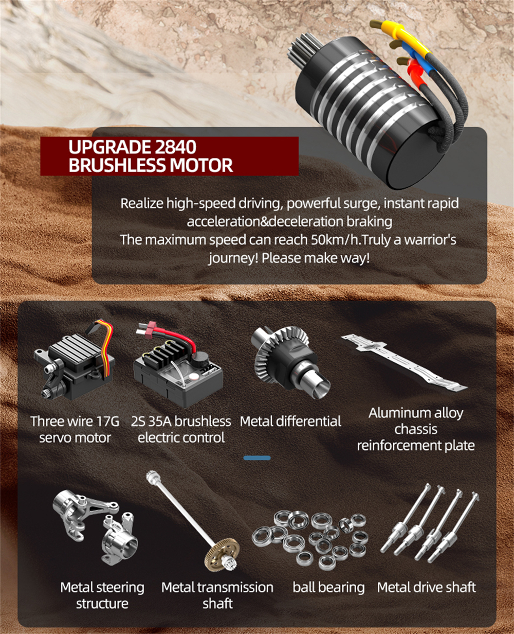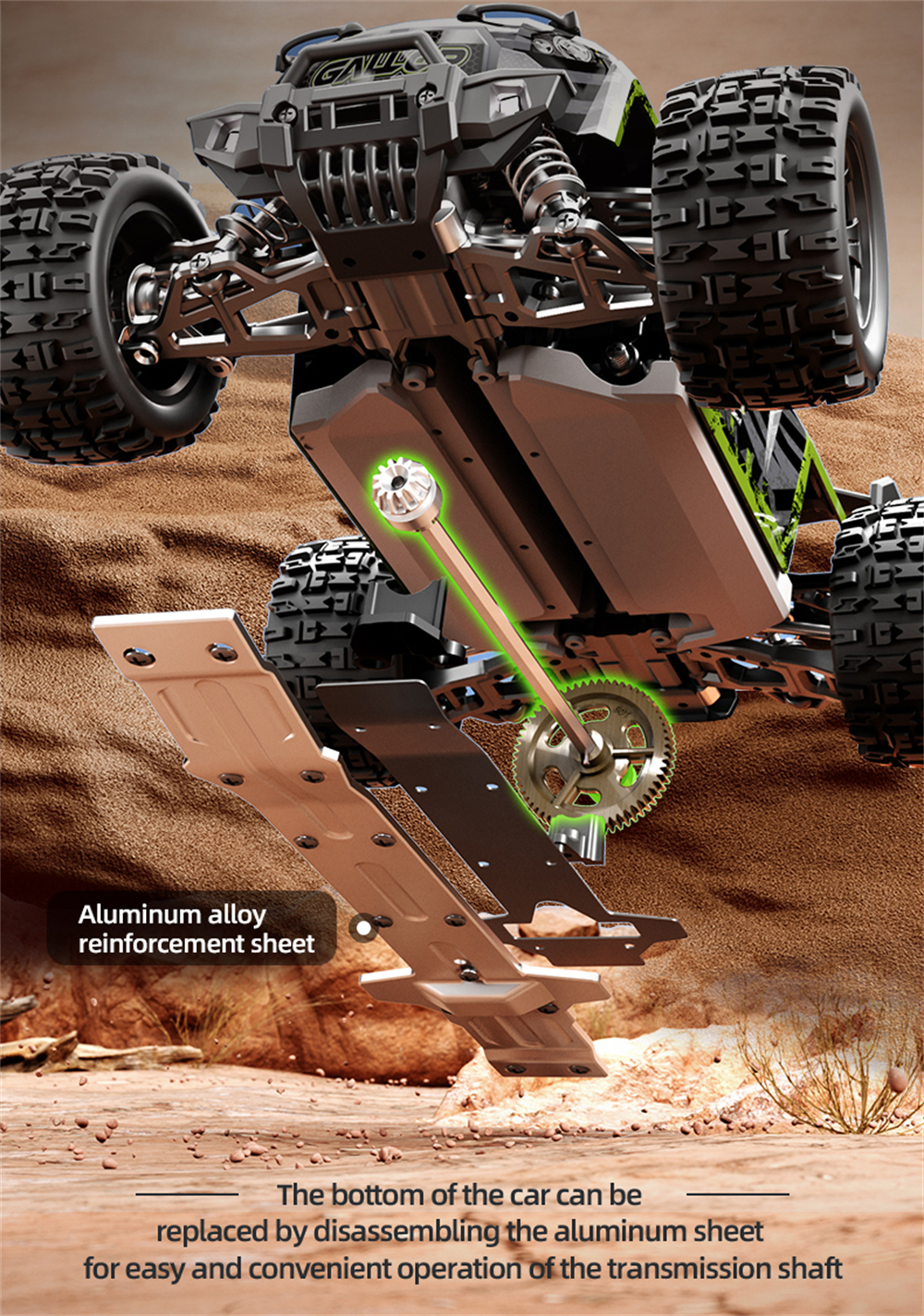 1. It adopts simulation structure design, has the control feeling of real car, realizes full-proportional stepless speed change, high-speed driving, sudden acceleration, deceleration, braking, reversing, left turn, right turn;2. Applicable sites: flat land, sand, mud, grass.3. Four-wheel drive: front and rear upright spring shock absorber, double wishbone independent suspension system;4. Remote control system: 2.4G full-proportional synchronous remote control system. Full-proportional throttle/steering;5. Electric adjustment: 2.4G splash-proof four-way 35A integrated electric adjustment/receiver;6. Drive shaft structure: front wheel cross ball head universal joint drive shaft, rear wheel split dog bone drive shaft;7. Servo parameters: three-wire 17G servo;8. Battery parameters: 7.4V, 18650-1500mAh Li-ion battery (T plug);9. Ball bearings: The whole car uses 15 ball bearings;10. Metal parts: metal underbody reinforcement plate, metal differential, metal gear, metal steering knuckle, metal front and rear arm bracket, metal middle drive shaft;11. Car shell: The car shell uses high-toughness explosion-proof PVC car shell; the car shell comes with anti-lost silicone buckle;12. Lighting: Equipped with LED headlights and front top lights; (three gear modes: always on, slow flash, fast flash);13. Other equipment: equipped with head-up wheels;14. Simulated big tires with strong grip;