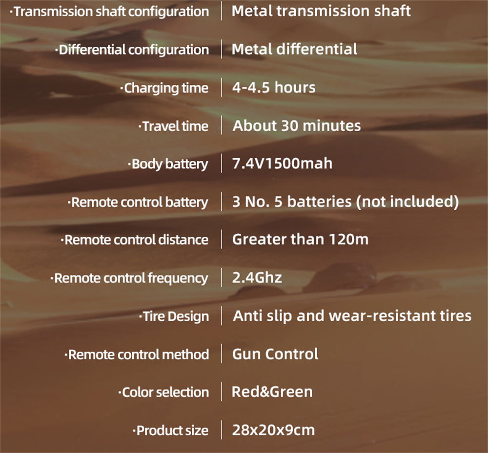 | Transmitter | Frequency:2.4G Channel:4CH Remote Distance:≥100m Required Battery:3X 1.5V AA battery(not included) |