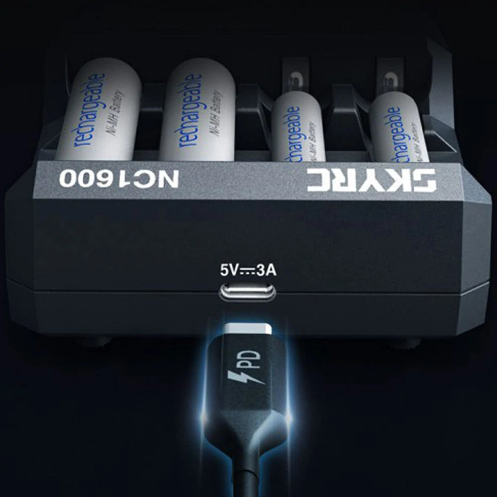 When powered by 15W QC3.0, PD 5V/3.0A adaptor: 1600mA/slot for 3 batteries; 1500mA/slot for 4 batteries.