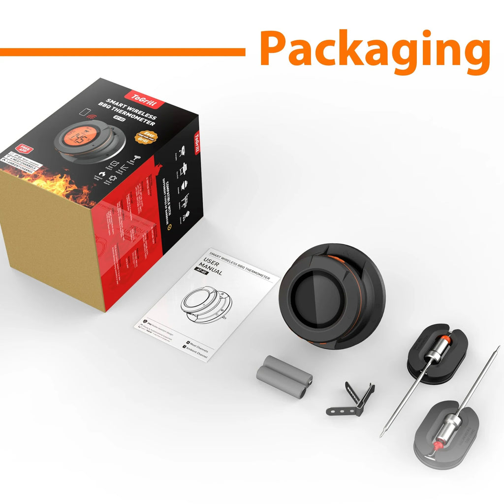 -Thermometer for barbecue/grill/smoker/grill cart.-Upgrade Lid thermometer for temperature control in the cooking chamber.-With 2/4 stainless steel insertion probes for measuring core temperature.-Convenient operation via smartphone with free app for iOS & Android (German, English and 6 other languages).-Pre-programmed settings for types of meat and doneness, many alarm settings can be configured.-Meat Probes Quantity:2PCS