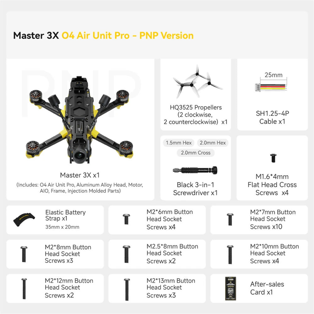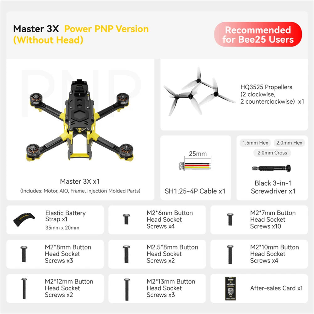 Born from SpeedyBee's modular DNA. Compatible with Bee25 head modules - upgrade endlessly,not replace endlessly. With a innovative balanced head mount, X-frame low-CG aggression, and seamless freestyle-to-cine fluidity, the Master 3X redefines FPVfreedom for rule-breaking pilots.