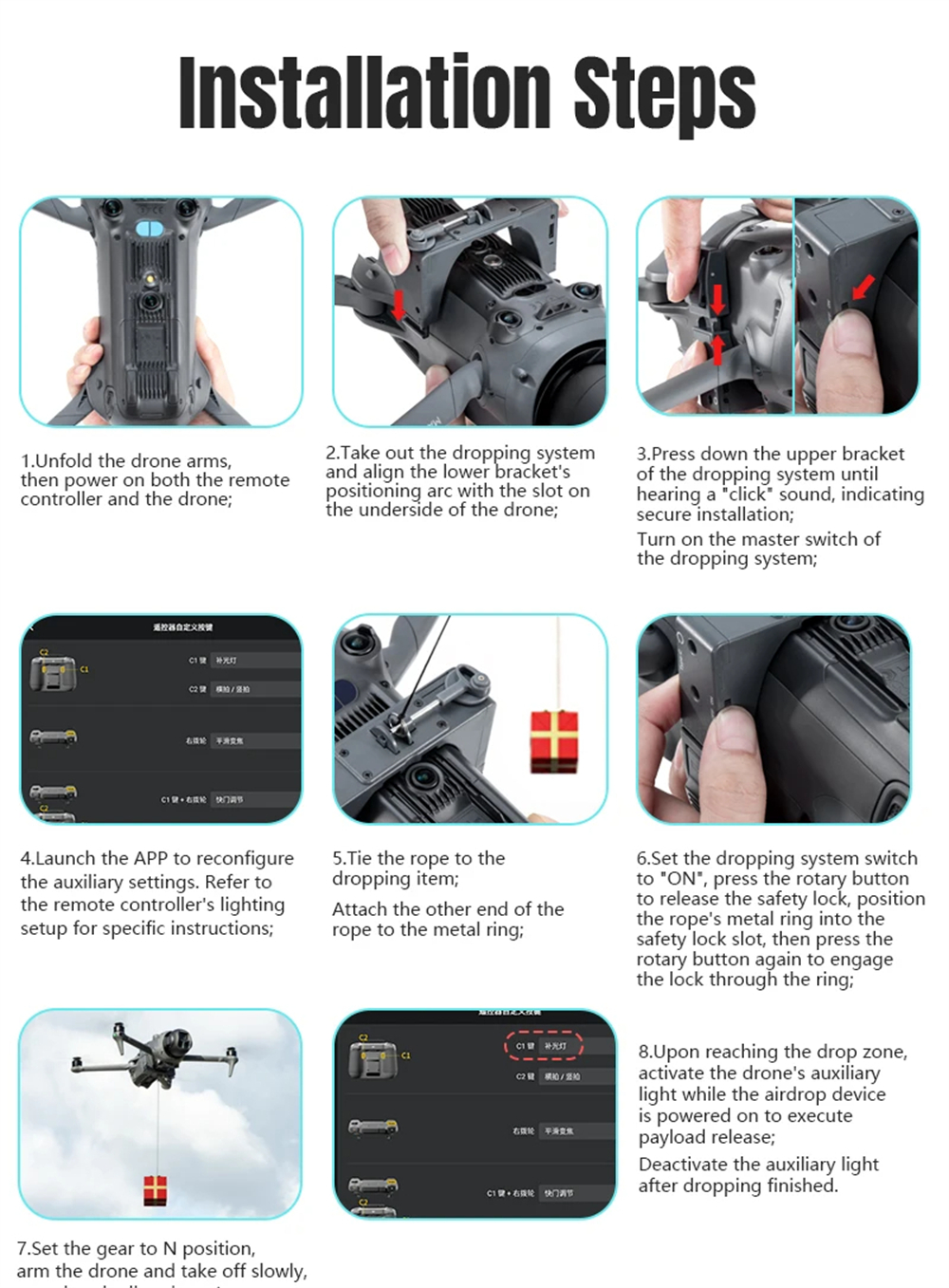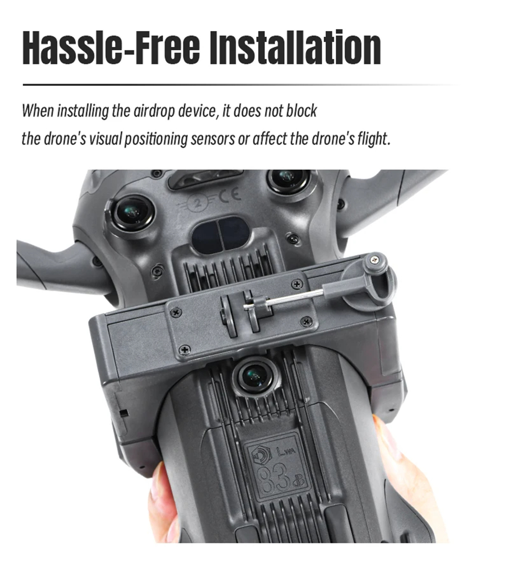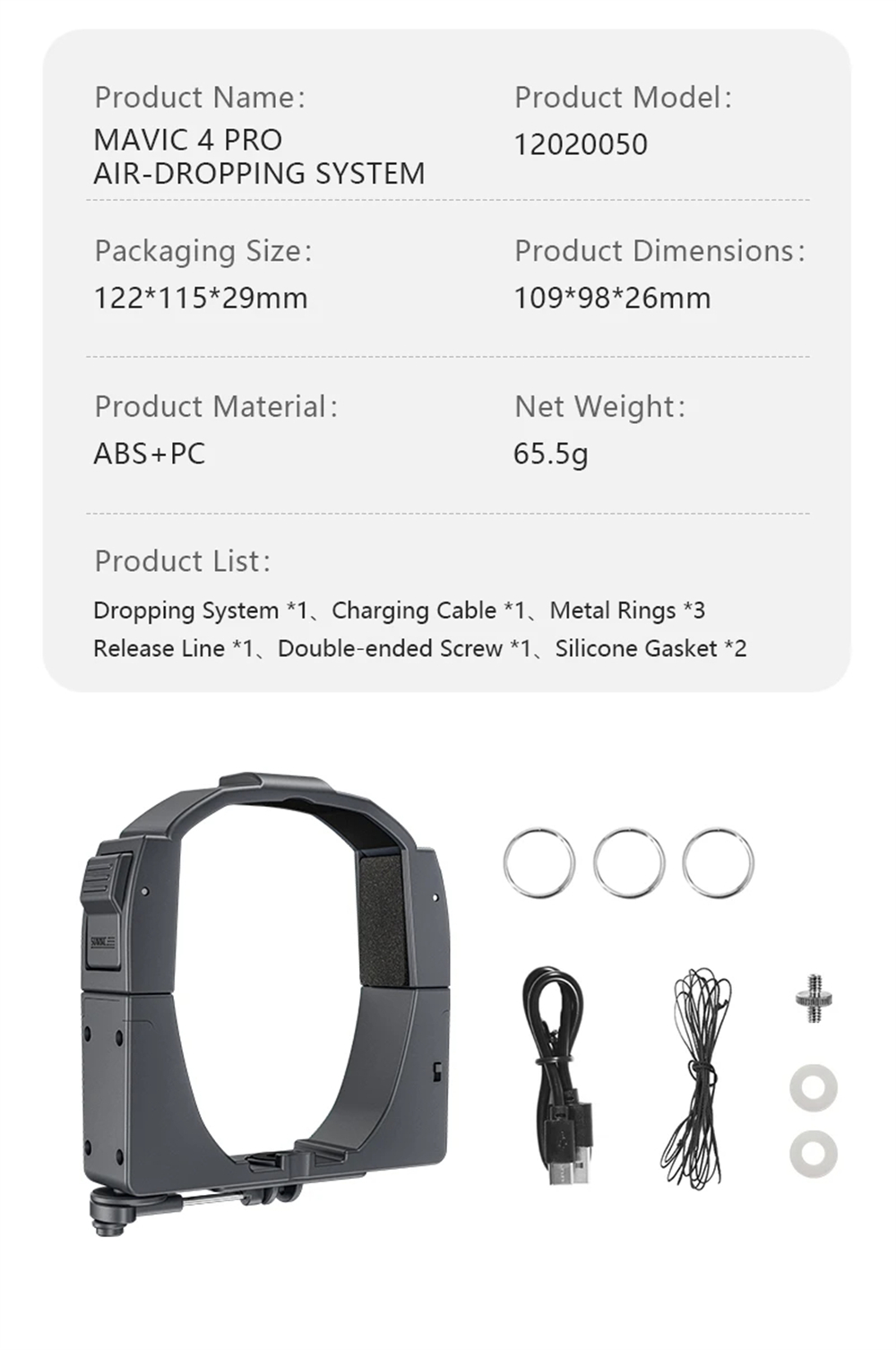 1. The remote control drone delivery device is specially customized for the DJI Mavic4Pro drone, with a dual function design of an extension bracket and a delivery device. The upper part can be used to carry small items such as sports cameras through the 1/4 male head screw on the extension bracket, and the lower part can be used as a delivery device to deliver objects, achieving dual gameplay. 2. Light sensitive setting, can be directly controlled by DJI remote control for dispensing. By controlling the drone's fill light through the remote control, items can be dropped. Turning on the drone's fill light will start dropping, and turning off the fill light after dropping is complete. The drop distance is the same as the drone's remote control distance. 3. The recommended maximum load is about 480g (less than 480g is required for loading and dropping items, with a load range of 450-480g). The built-in battery has a capacity of 50mAh and can be fully charged in half an hour. After being fully charged, it can be used about 400 times. 4. Easy to install and disassemble, fixed to the body through a mounting bracket, with a card slot on the dispenser that won't shake or loosen, and won't obstruct the drone's visual positioning sensor. The entire set weighs 65.5g and won't affect the drone's flight. 5. It can be used in various scenarios such as advertising, baiting, gift throwing, wedding flower delivery, ring delivery, food delivery, field medical aid rescue, family reunion, Halloween, Christmas, Valentine's Day, birthday parties, beach parties, etc., adding infinite fun to life.