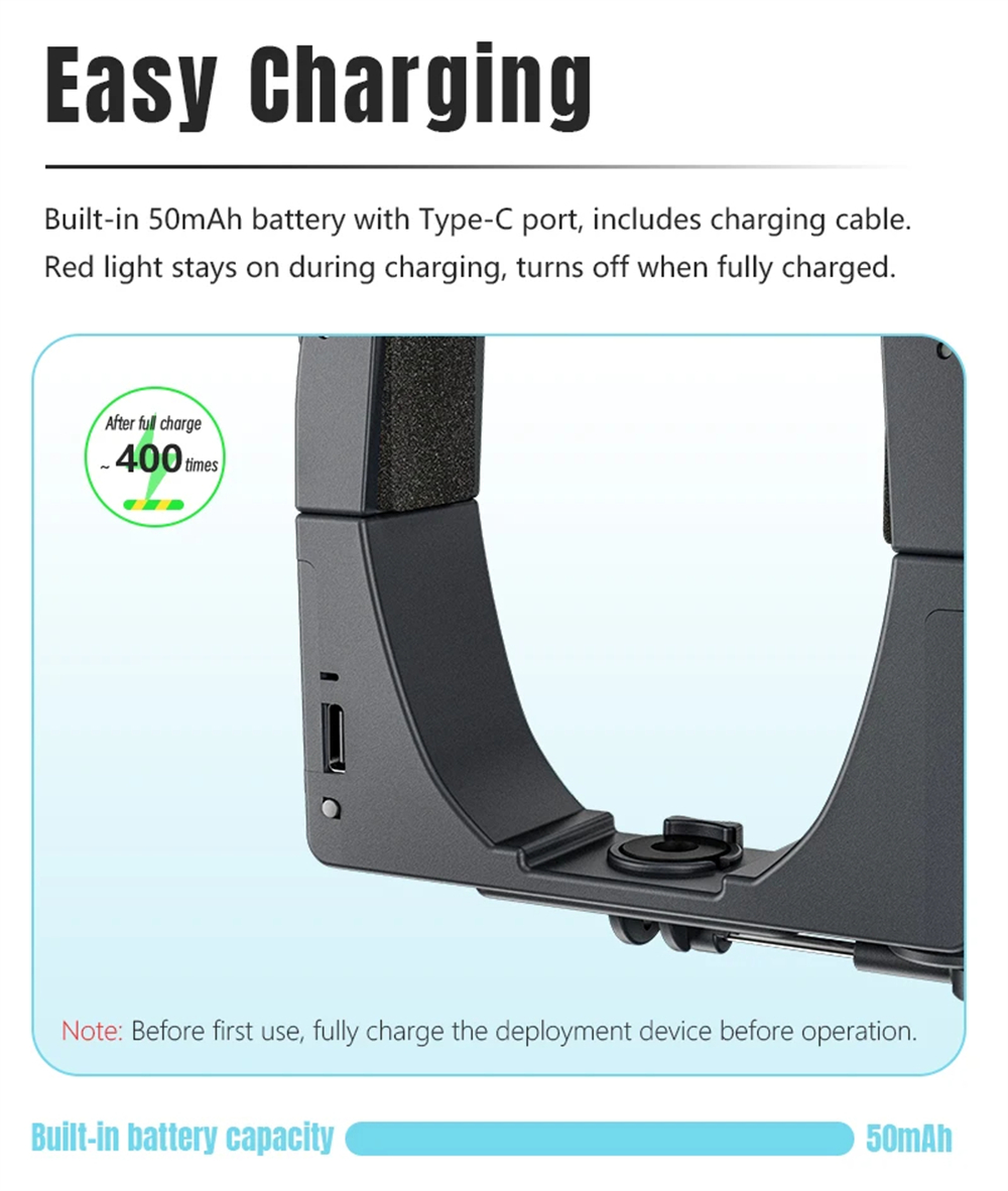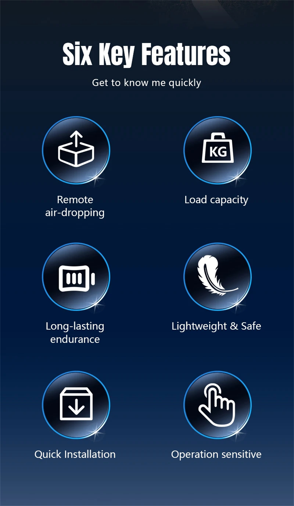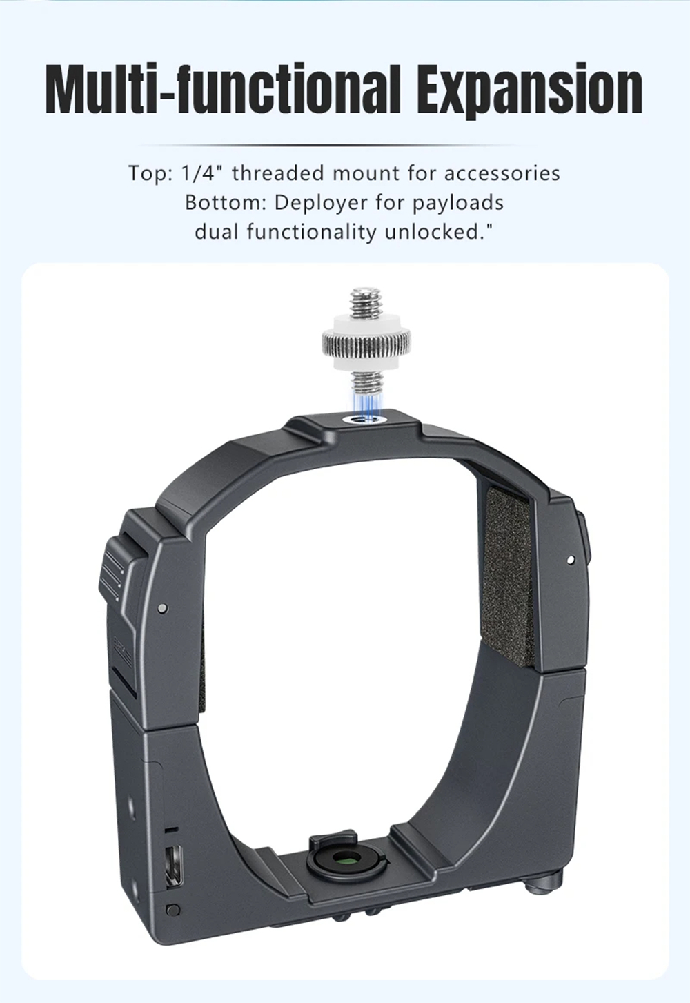 1. The remote control drone delivery device is specially customized for the DJI Mavic4Pro drone, with a dual function design of an extension bracket and a delivery device. The upper part can be used to carry small items such as sports cameras through the 1/4 male head screw on the extension bracket, and the lower part can be used as a delivery device to deliver objects, achieving dual gameplay. 2. Light sensitive setting, can be directly controlled by DJI remote control for dispensing. By controlling the drone's fill light through the remote control, items can be dropped. Turning on the drone's fill light will start dropping, and turning off the fill light after dropping is complete. The drop distance is the same as the drone's remote control distance. 3. The recommended maximum load is about 480g (less than 480g is required for loading and dropping items, with a load range of 450-480g). The built-in battery has a capacity of 50mAh and can be fully charged in half an hour. After being fully charged, it can be used about 400 times. 4. Easy to install and disassemble, fixed to the body through a mounting bracket, with a card slot on the dispenser that won't shake or loosen, and won't obstruct the drone's visual positioning sensor. The entire set weighs 65.5g and won't affect the drone's flight. 5. It can be used in various scenarios such as advertising, baiting, gift throwing, wedding flower delivery, ring delivery, food delivery, field medical aid rescue, family reunion, Halloween, Christmas, Valentine's Day, birthday parties, beach parties, etc., adding infinite fun to life.
