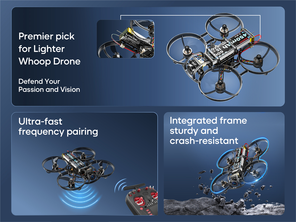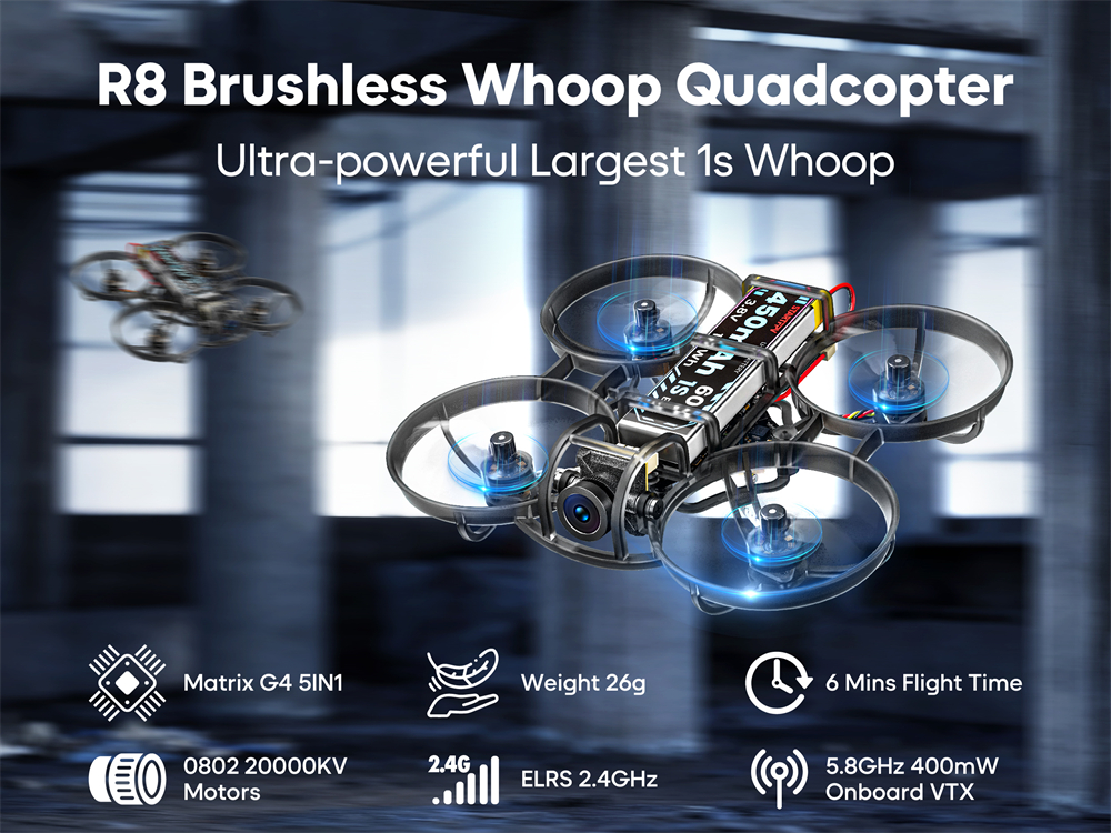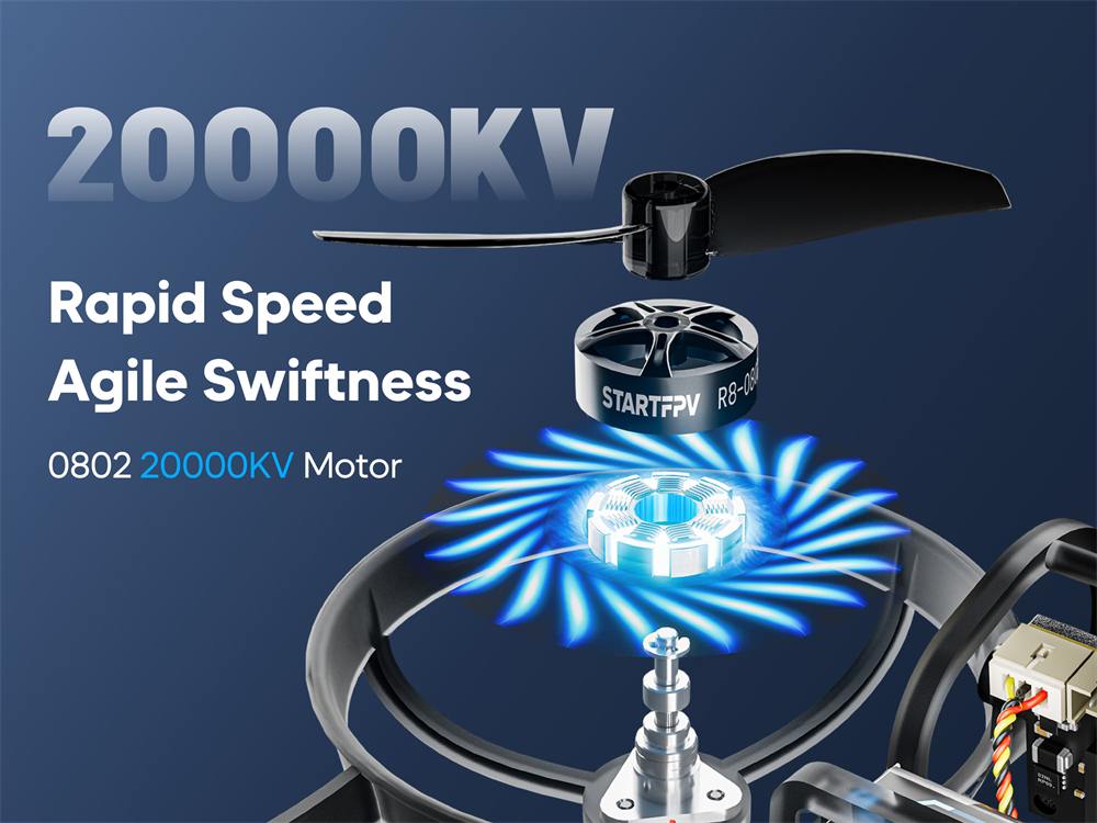 5. Self-Developed High-Performance Motors: R8-0802 20000KV, single motor thrust 33g, maximum power efficiency of 3.58g/W at 37% throttle, exceptional thrust-to-weight ratio, outstanding power performance, meeting the needs of different flight styles.