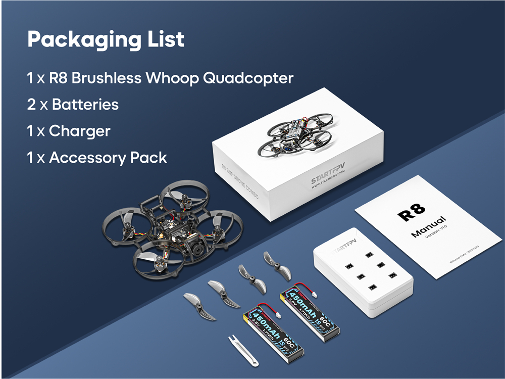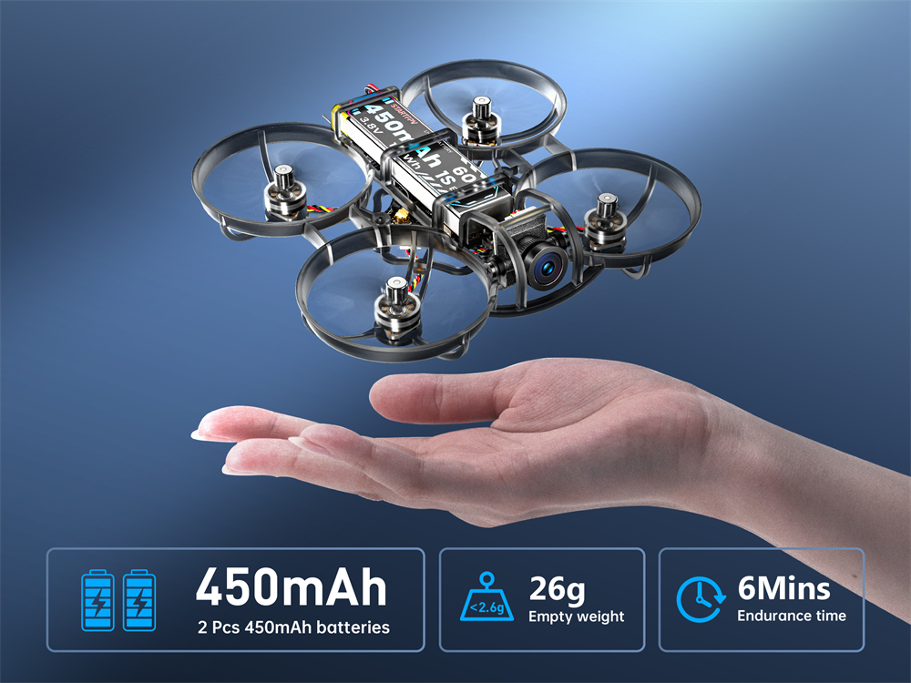7. Battery life: Standard 450mAh battery, combined with lightweight design, provides up to 6 minutes of stable flight time.