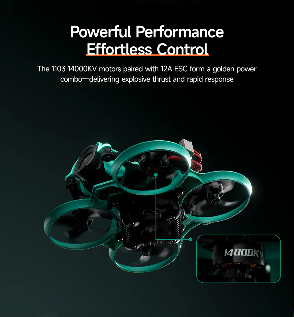 3. Powered by 1103 14000KV motors, delivering ample thrust for agile and sharp, responsive flight performance.
