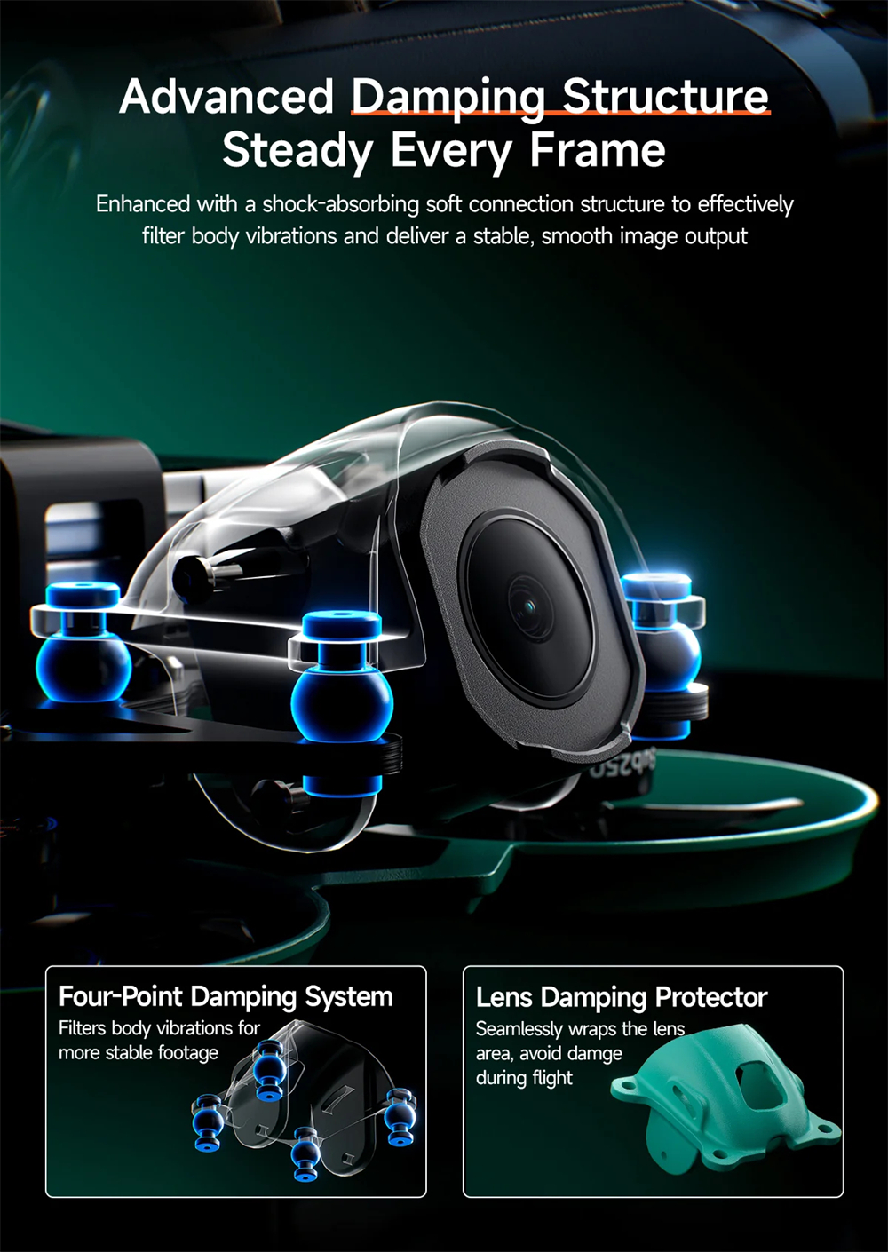 2. Safe and reliable camera vibration-damped cap, effectively reduces frame vibrations, ensuring silky-smooth video while safeguarding your lens during flight.