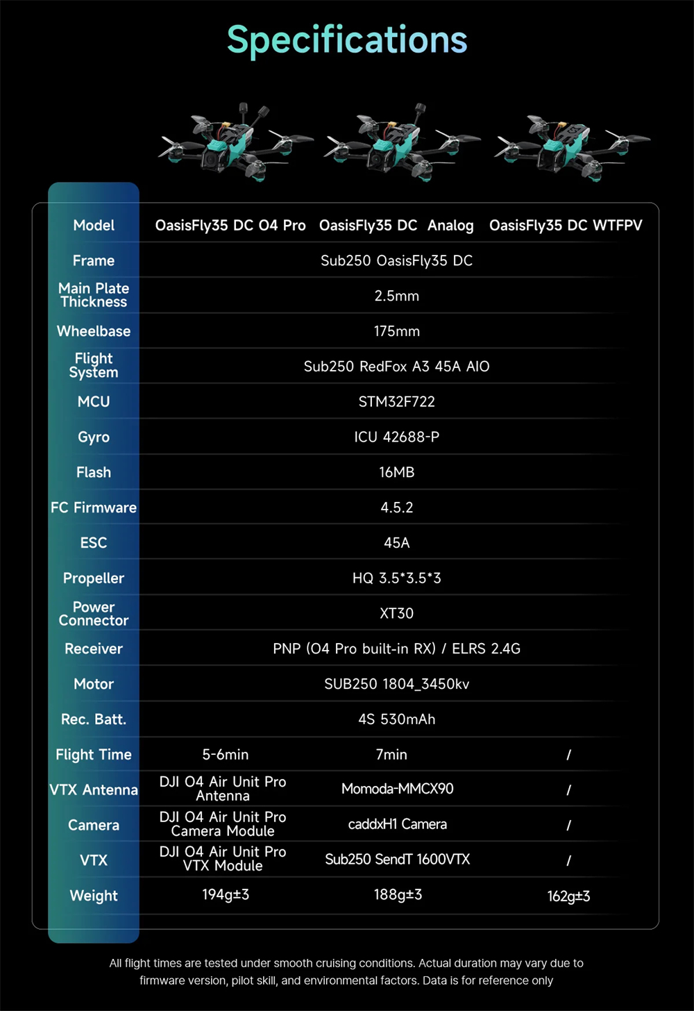 OasisFly35 -- Max compatible with O4 Pro HD VTX. DC frame + 1804 motors deliver strong thrust and clean, wide visuals. Redfox A3 45A AIO ensures fast respose and high efficiency. GPS included for reliable RTH in any environment.