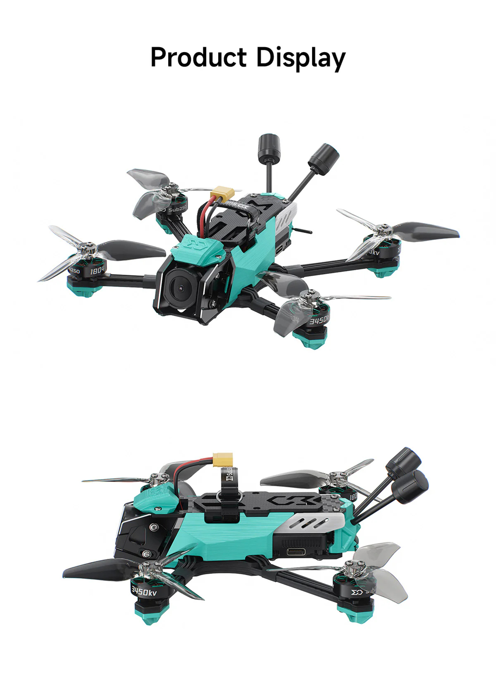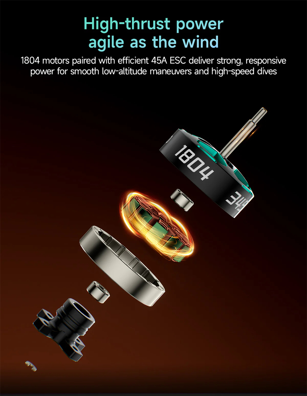 3. 1804 3450KV motors + 45A AIO ESC ensure fast respose for all flight maneuvers.