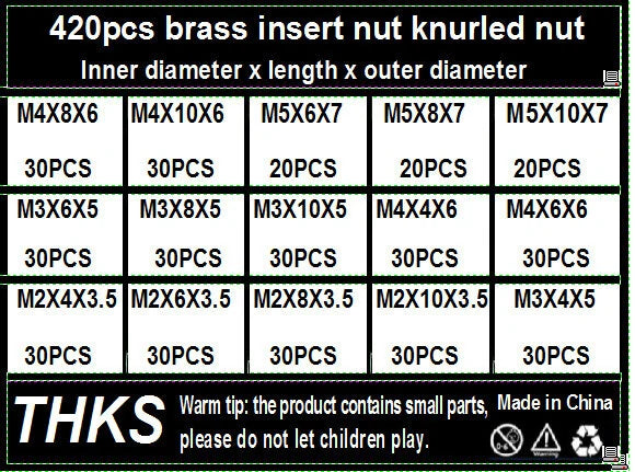 ✔PACKAGE INCLUDE --- The whole set contains 420pcs 4 sizes knurled threaded insert nuts, package in durable transparent box with label. It is easy to distinguish the size of the product, you can choose the suitable one to meet all your needs.