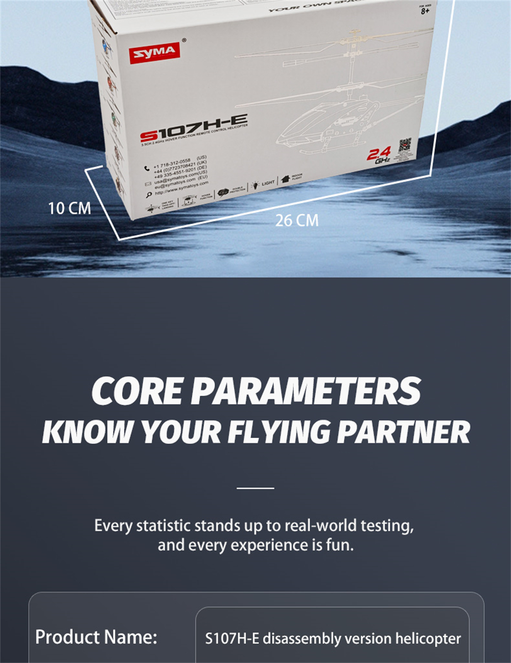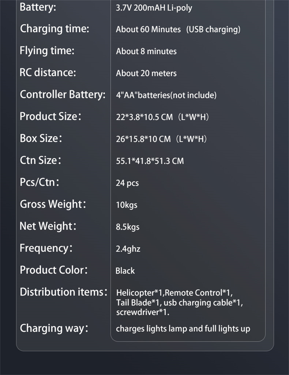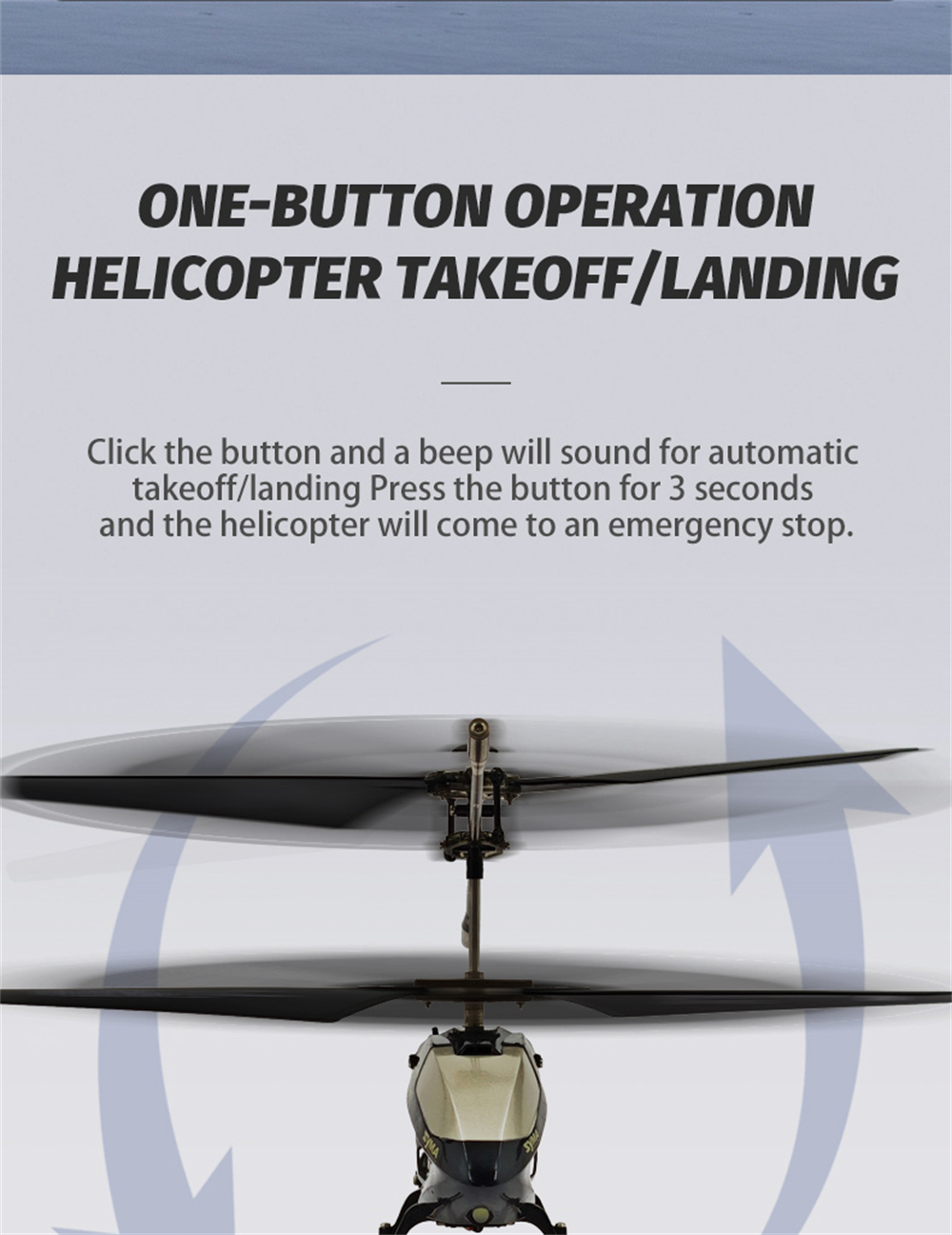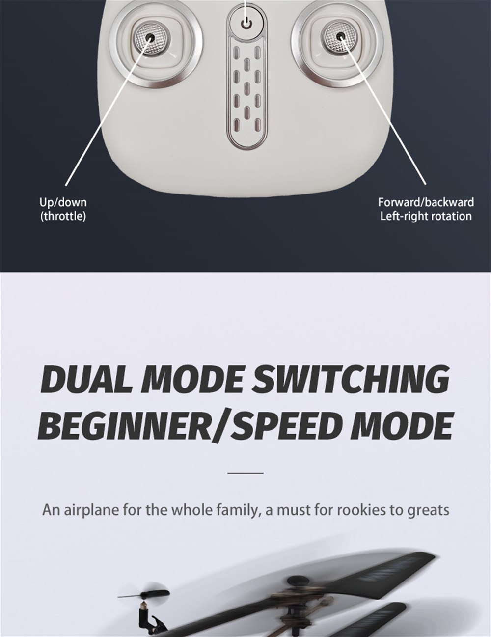Suitable for indoor flight, it has full proportional operation functions such as ascent/descent/forward/backward/left and right turn, one-touch takeoff/landing and horizontal altitude hold function.