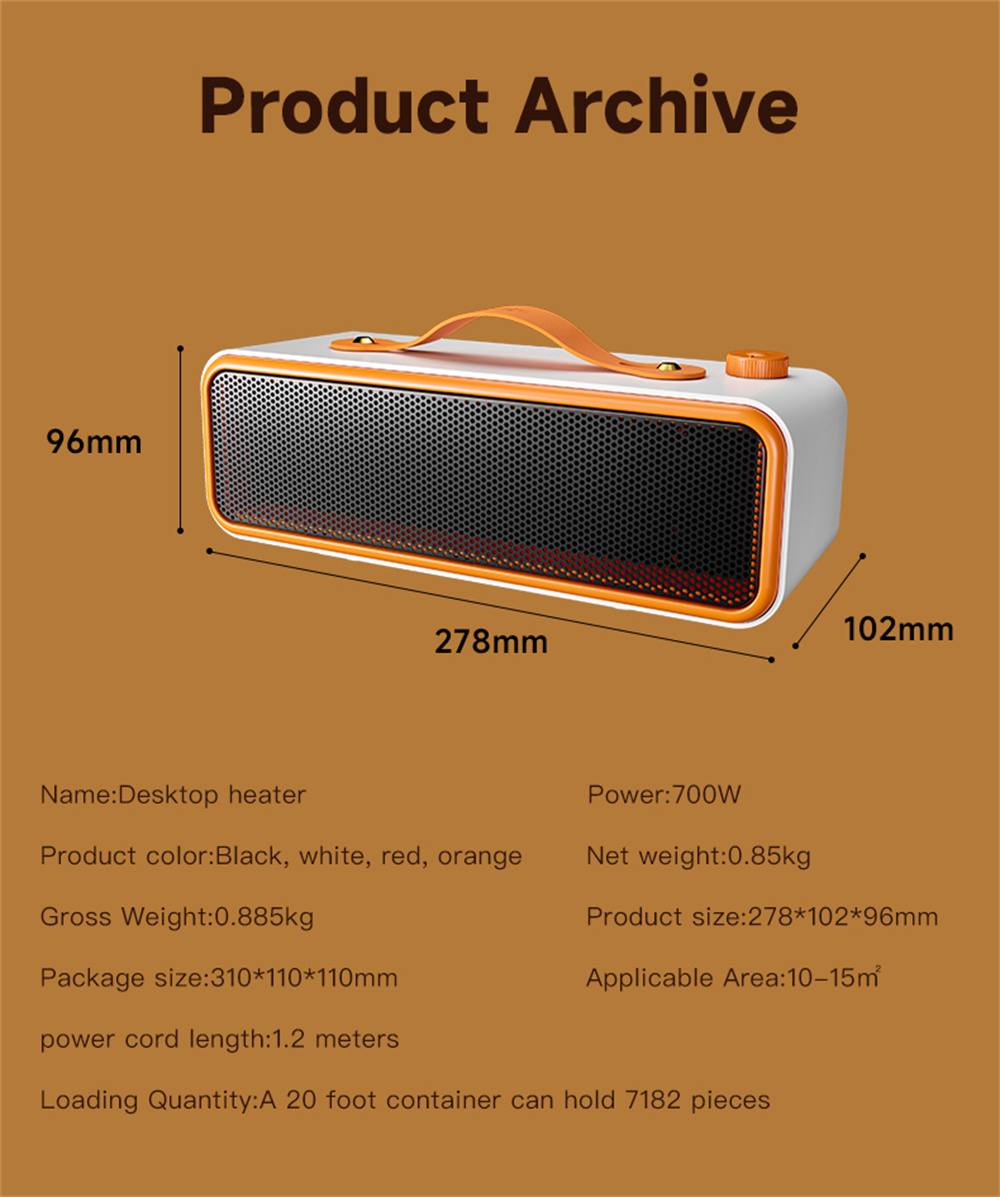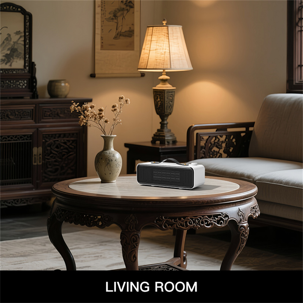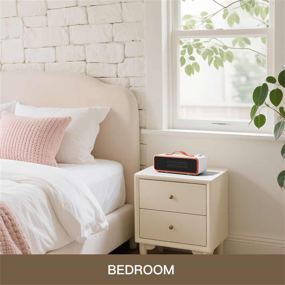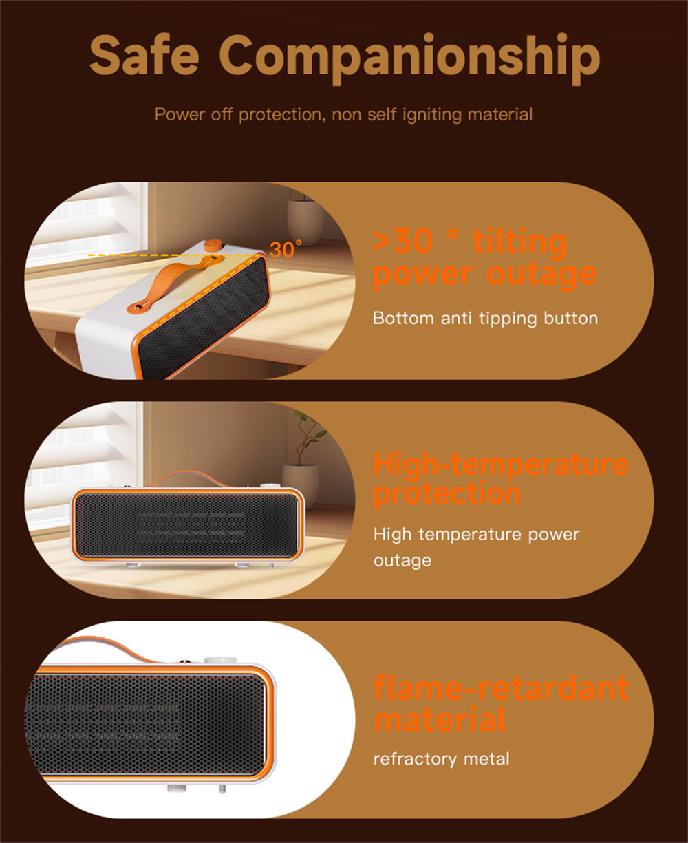 1.Two Heating Modes: Choose between low and high heat settings for personalized comfort, perfect for cold mornings or chilly evenings.2.Smart Constant Temperature Control: Automatically maintains a stable and cozy temperature, preventing overheating and ensuring energy-efficient performance.3.Wide-Angle Airflow: Enjoy balanced heat distribution with a wide-angle design that quickly warms your space evenly.4.Comprehensive Safety Protection: Built with multiple safety features including overload protection, intelligent temperature monitoring, tip-over shutoff, and anti-scald grille design for peace of mind.5.Stylish & Gift-Ready Design: Compact and elegant appearance makes it a thoughtful gift choice for Christmas or winter holidays — perfect for friends, parents, and loved ones.
