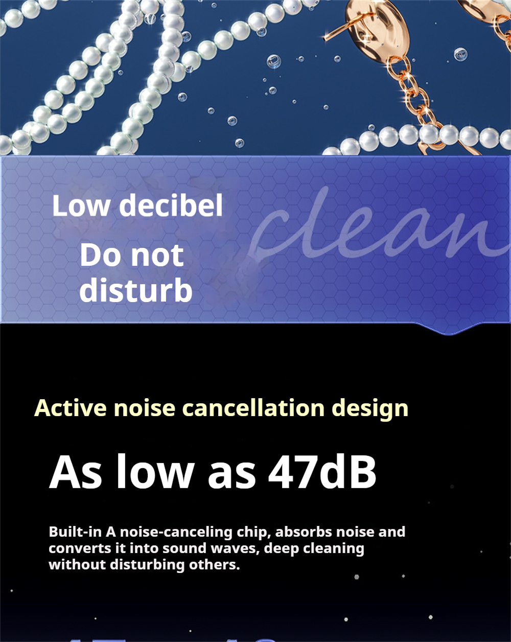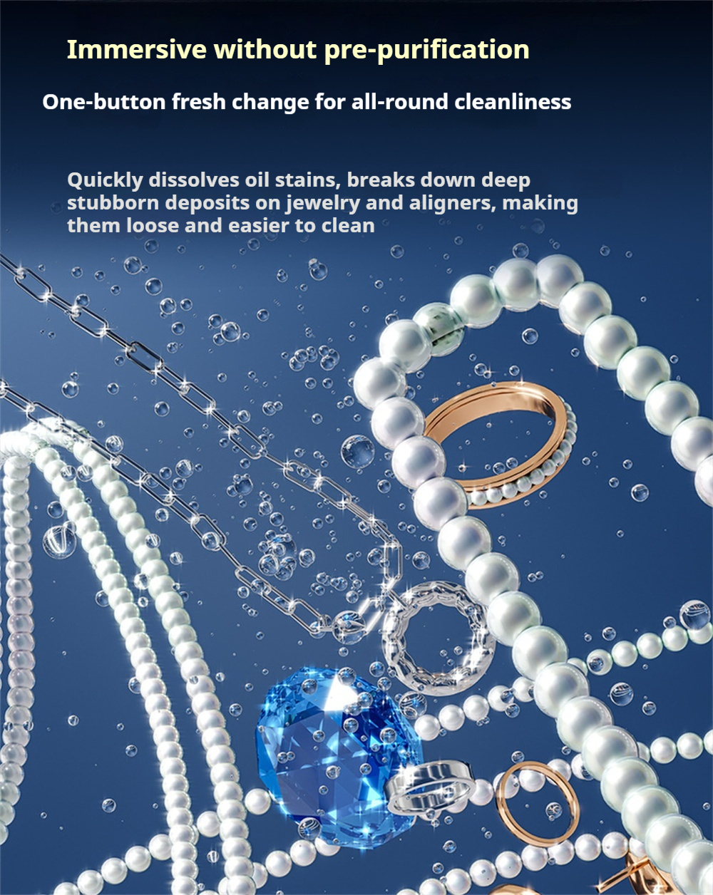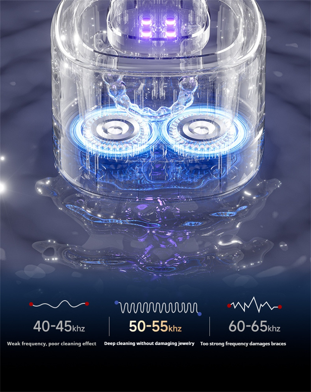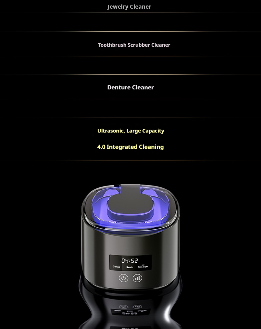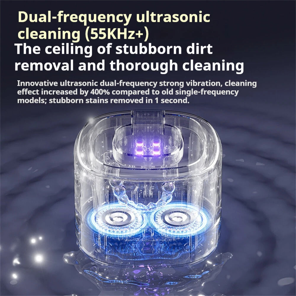 1. 55KHz Ultrasonic Deep CleaningHigh-frequency vibration generates microscopic bubbles to remove dirt and stains from jewelry, glasses, dentures, and more—without damage.2. UV Sterilization TechnologyBuilt-in ultraviolet light eliminates bacteria and odors, ensuring hygienic cleaning results for personal and household items.3. 3 Adjustable Cleaning ModesChoose between gentle, standard, or deep cleaning to suit different materials and levels of dirt.4. 380ML Large CapacitySpacious tank accommodates multiple items at once, saving time and allowing more efficient cleaning.5. 360° All-Round CleaningReaches every crevice for a thorough, even clean—ideal for detailed items like rings, watchbands, or braces.6. Smart Touch ControlUser-friendly touch screen design makes operation simple and stylish.