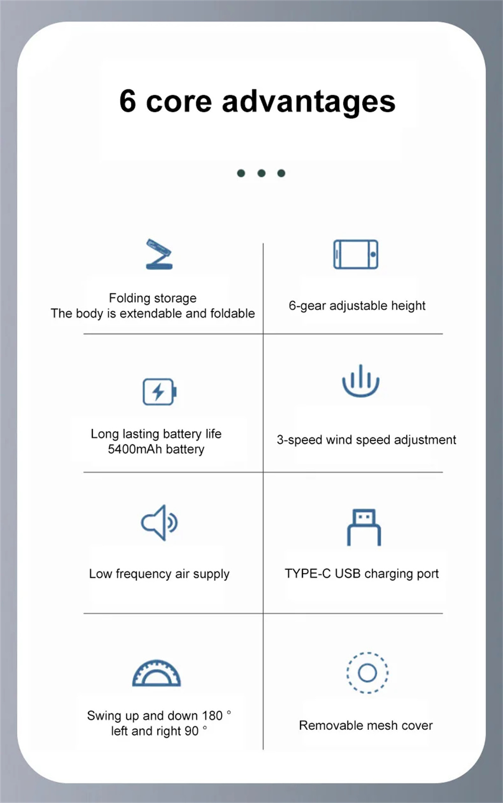 5) Upgraded all copper brushless motor and circulating fan blades, super quiet, strong wind, softer and quieter wind, long service life