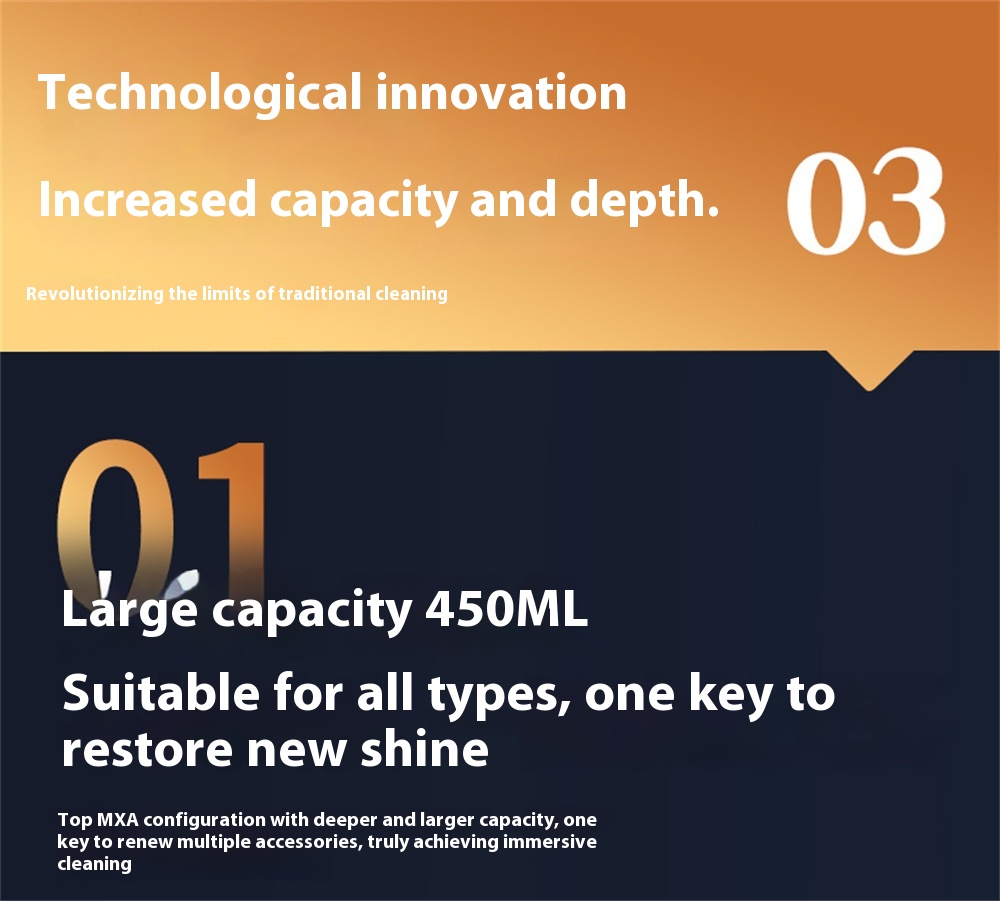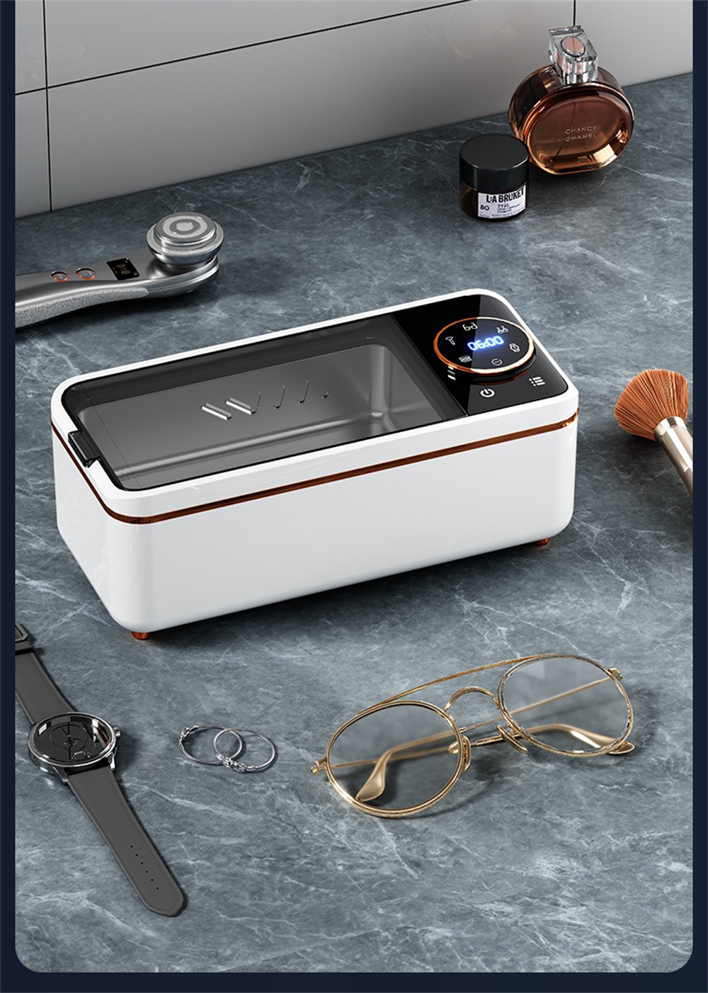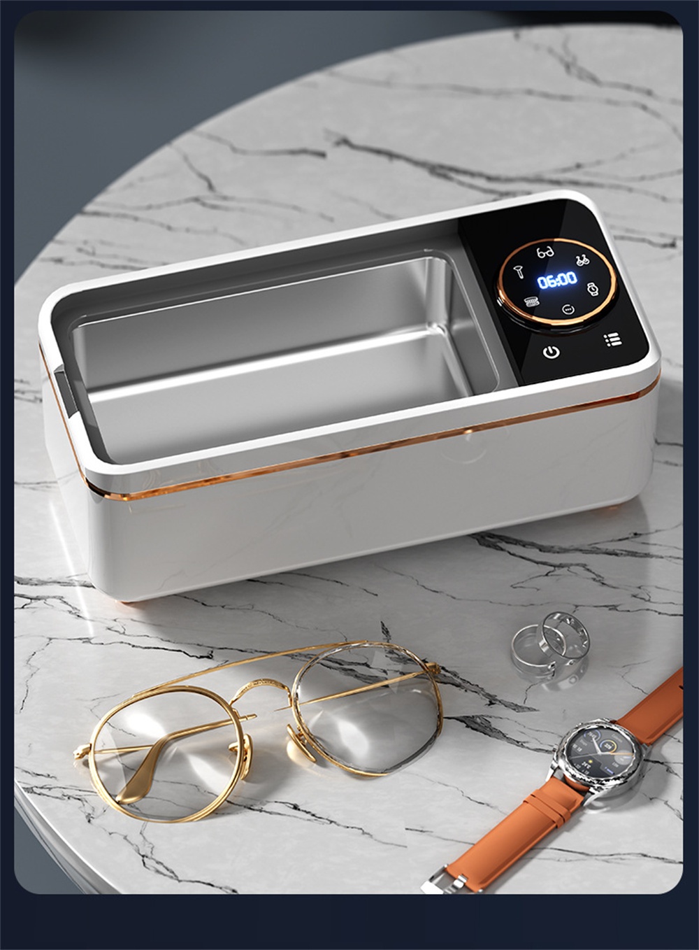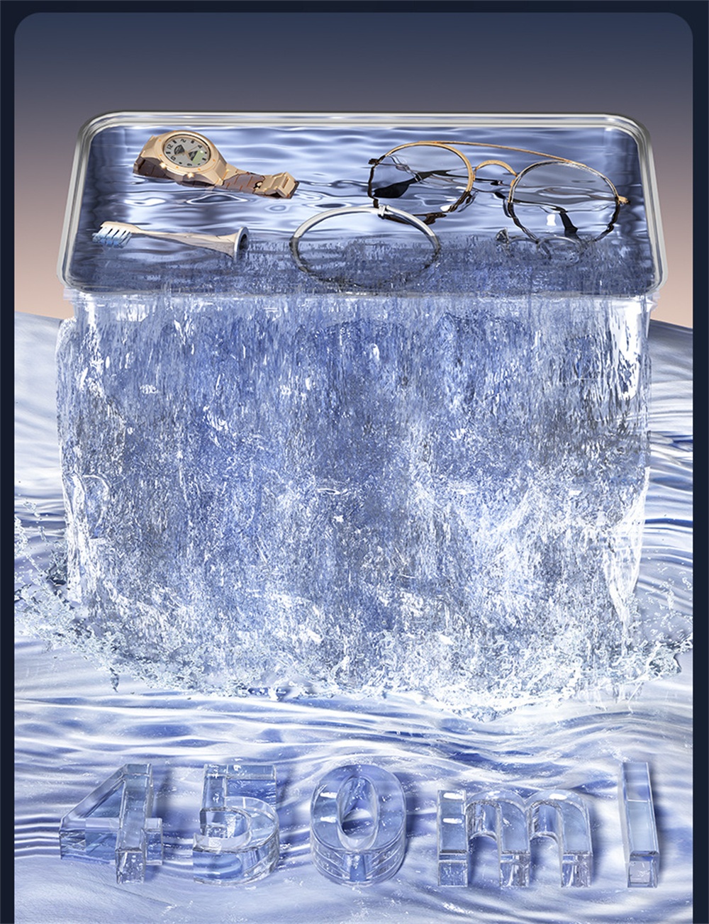 1. Multifunctional CleaningPerfect for jewelry, watches, glasses, sunglasses, toothbrushes, pacifiers, makeup brushes, pens, contact lenses, and more.2. Deep Ultrasonic CleaningHigh-frequency 60-65kHz vibrations create a cavitation effect that quickly removes stains, dirt, and grime from hard-to-reach crevices.3. Easy One-Key OperationAdd water, press one button, and enjoy 360° purification and efficient stain removal without hassle.4. Safe & Reliable DesignMade of ABS and 304 stainless steel for long-lasting use, resistant to wear and safe for daily household cleaning.5. Convenient 450ml CapacityLarge enough for multiple small items at once, saving time while keeping items sparkling clean.