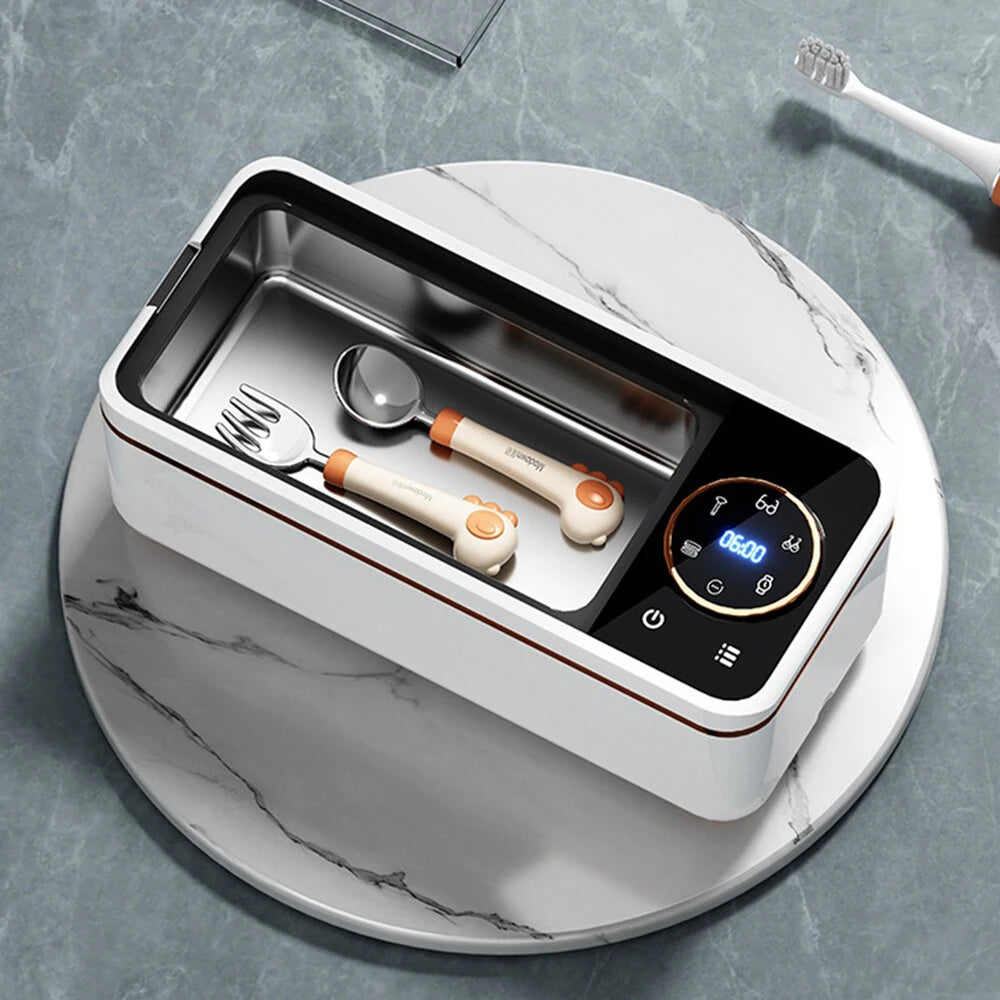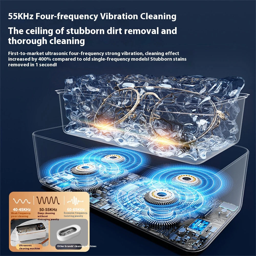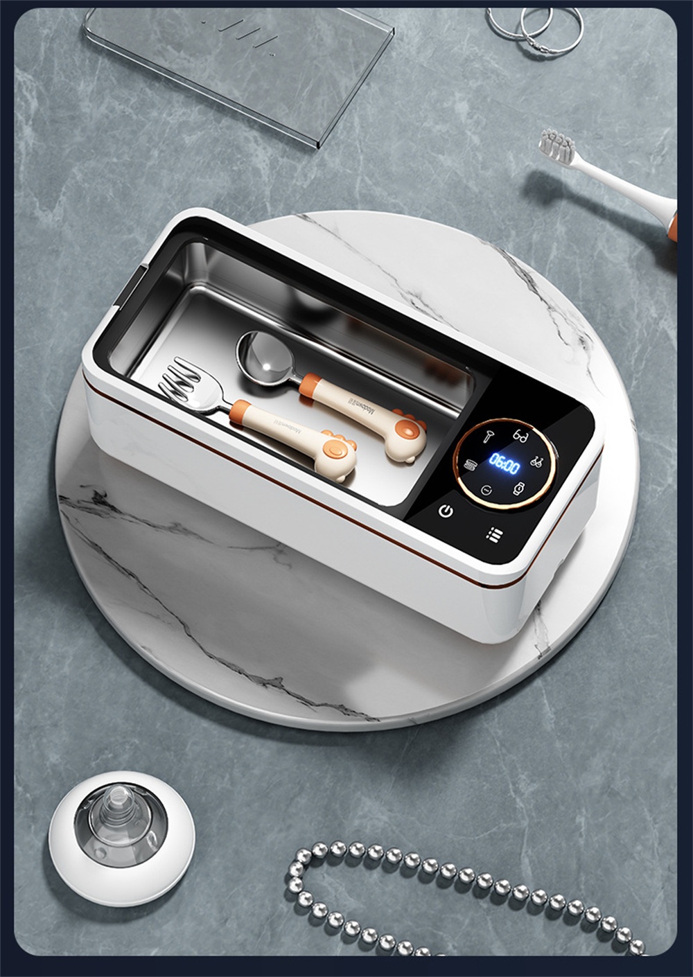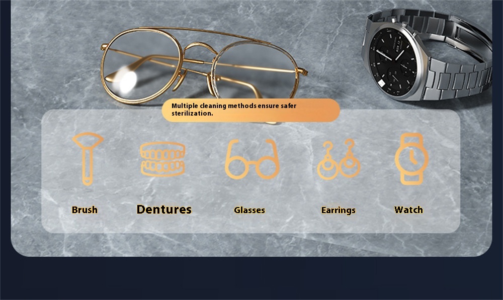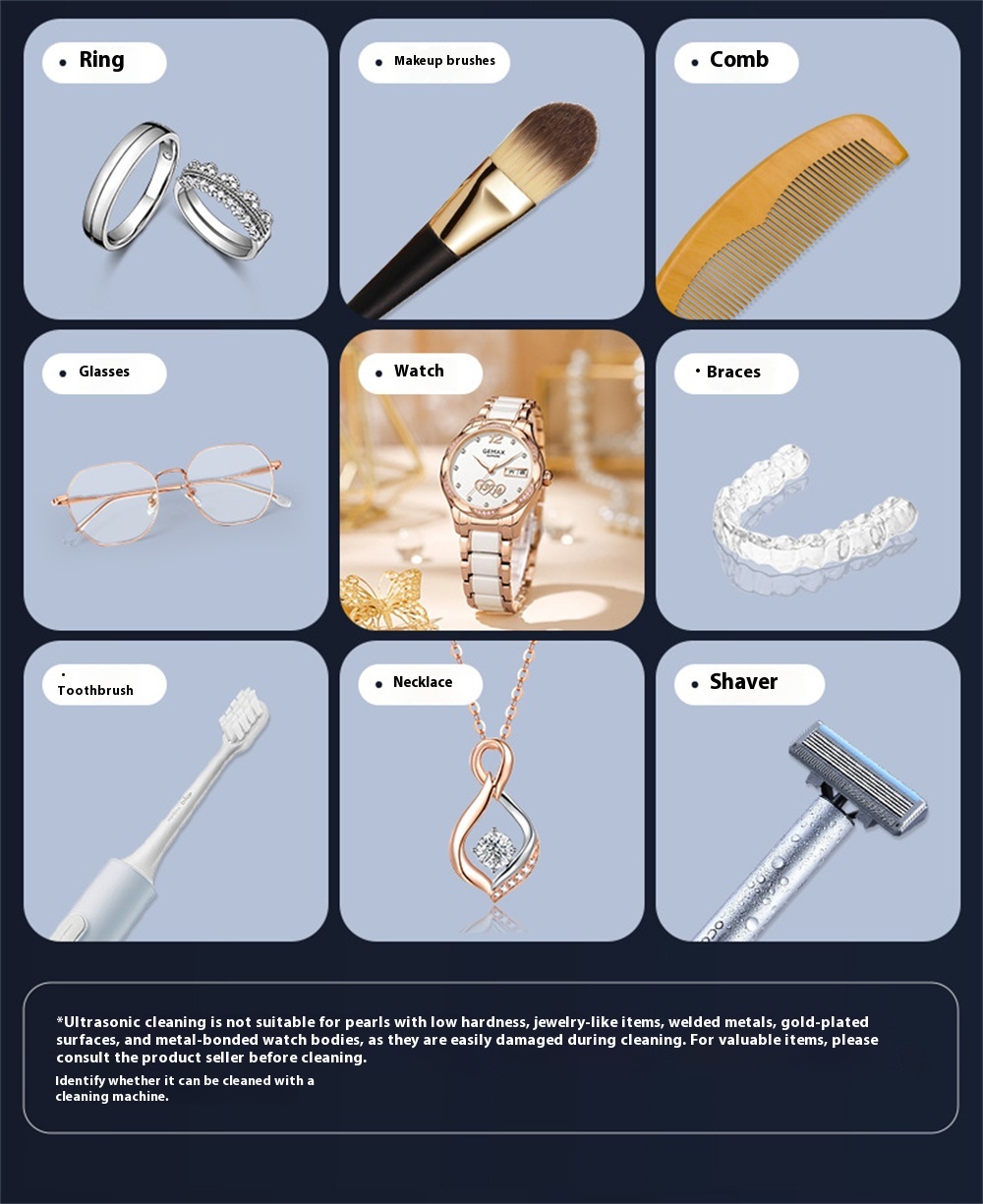 1. Multifunctional CleaningPerfect for jewelry, watches, glasses, sunglasses, toothbrushes, pacifiers, makeup brushes, pens, contact lenses, and more.2. Deep Ultrasonic CleaningHigh-frequency 60-65kHz vibrations create a cavitation effect that quickly removes stains, dirt, and grime from hard-to-reach crevices.3. Easy One-Key OperationAdd water, press one button, and enjoy 360° purification and efficient stain removal without hassle.4. Safe & Reliable DesignMade of ABS and 304 stainless steel for long-lasting use, resistant to wear and safe for daily household cleaning.5. Convenient 450ml CapacityLarge enough for multiple small items at once, saving time while keeping items sparkling clean.