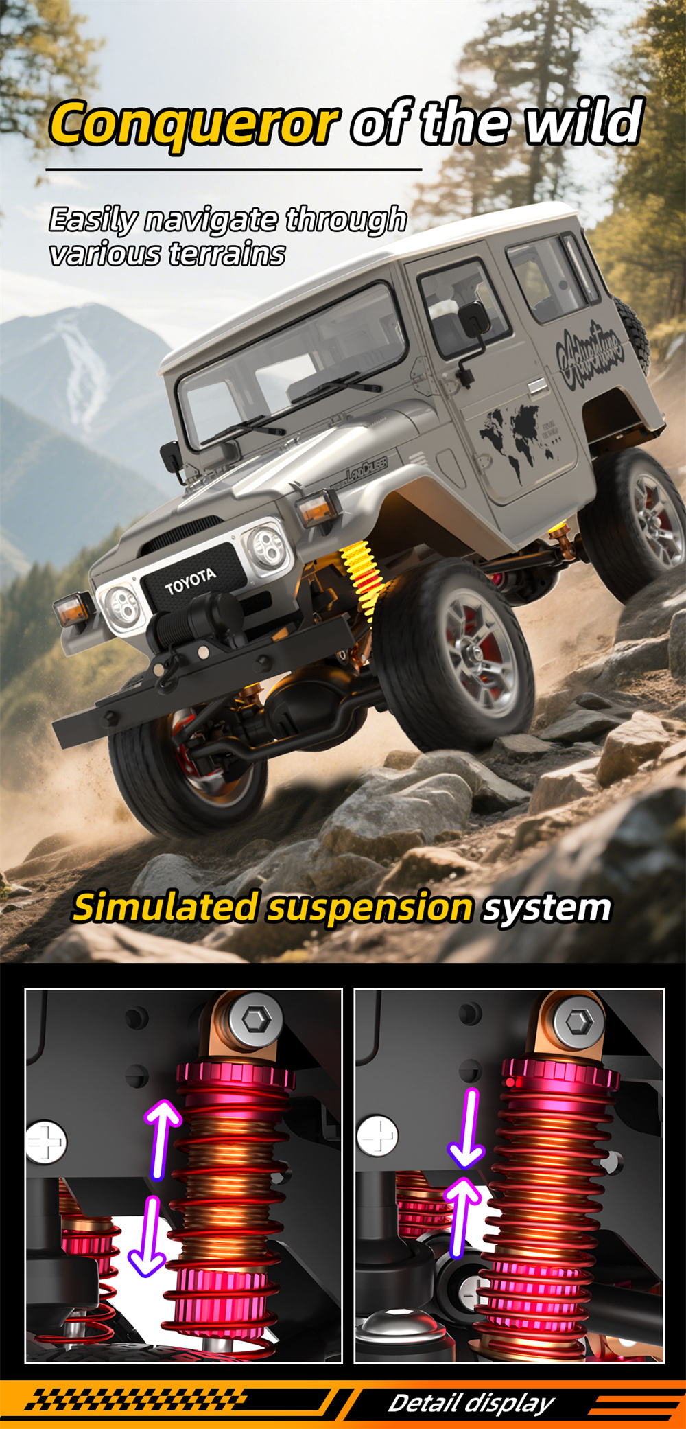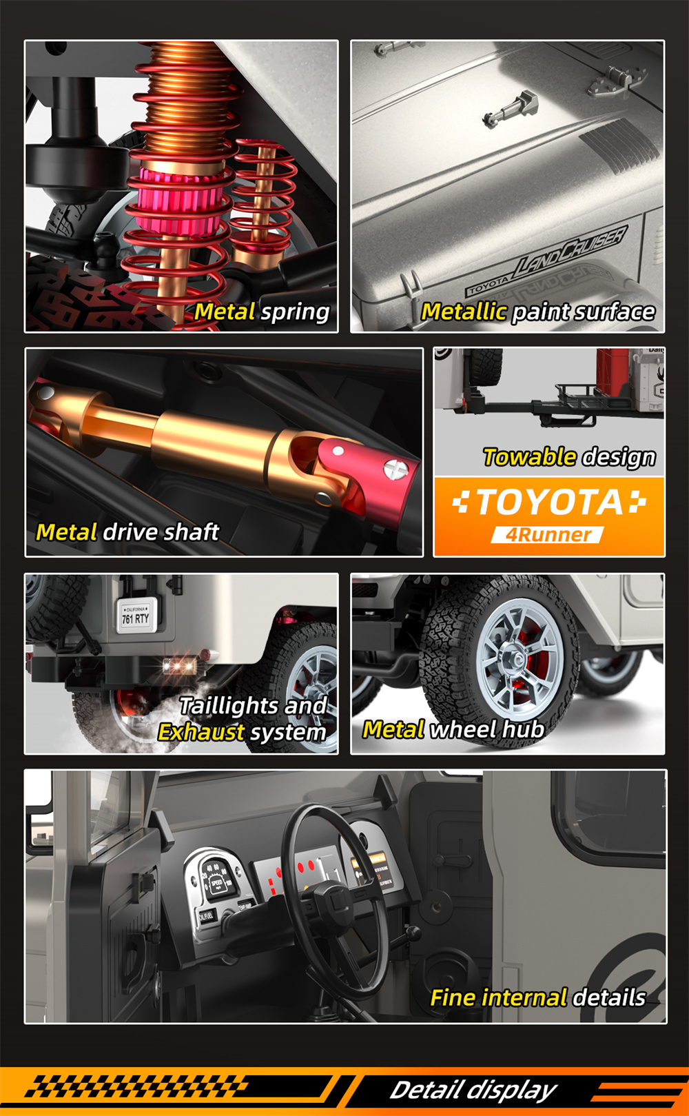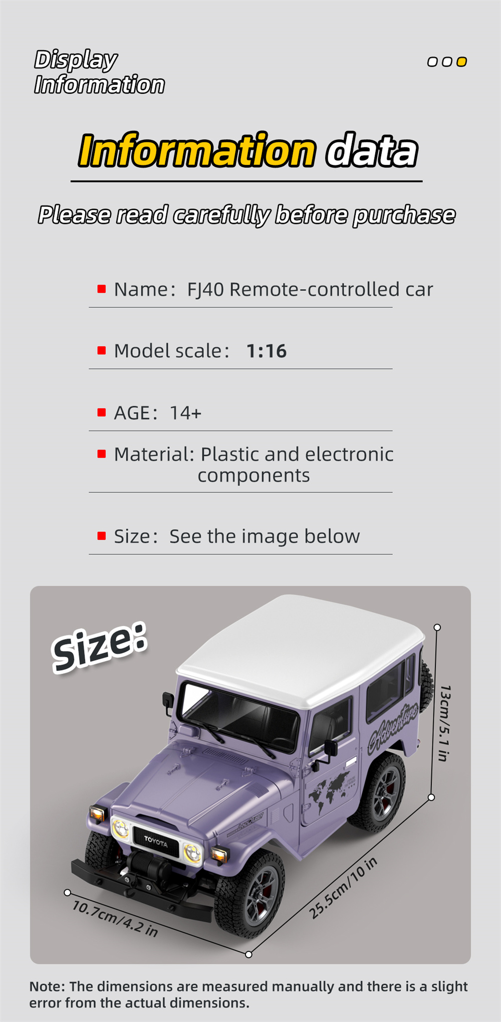Car Size:254.4*106.6*136mm Front Rear Track Width:136.8mm Left Right Track Width:89.6mm Tire Diameter:Φ50mm Box Size:295*161*221mm |