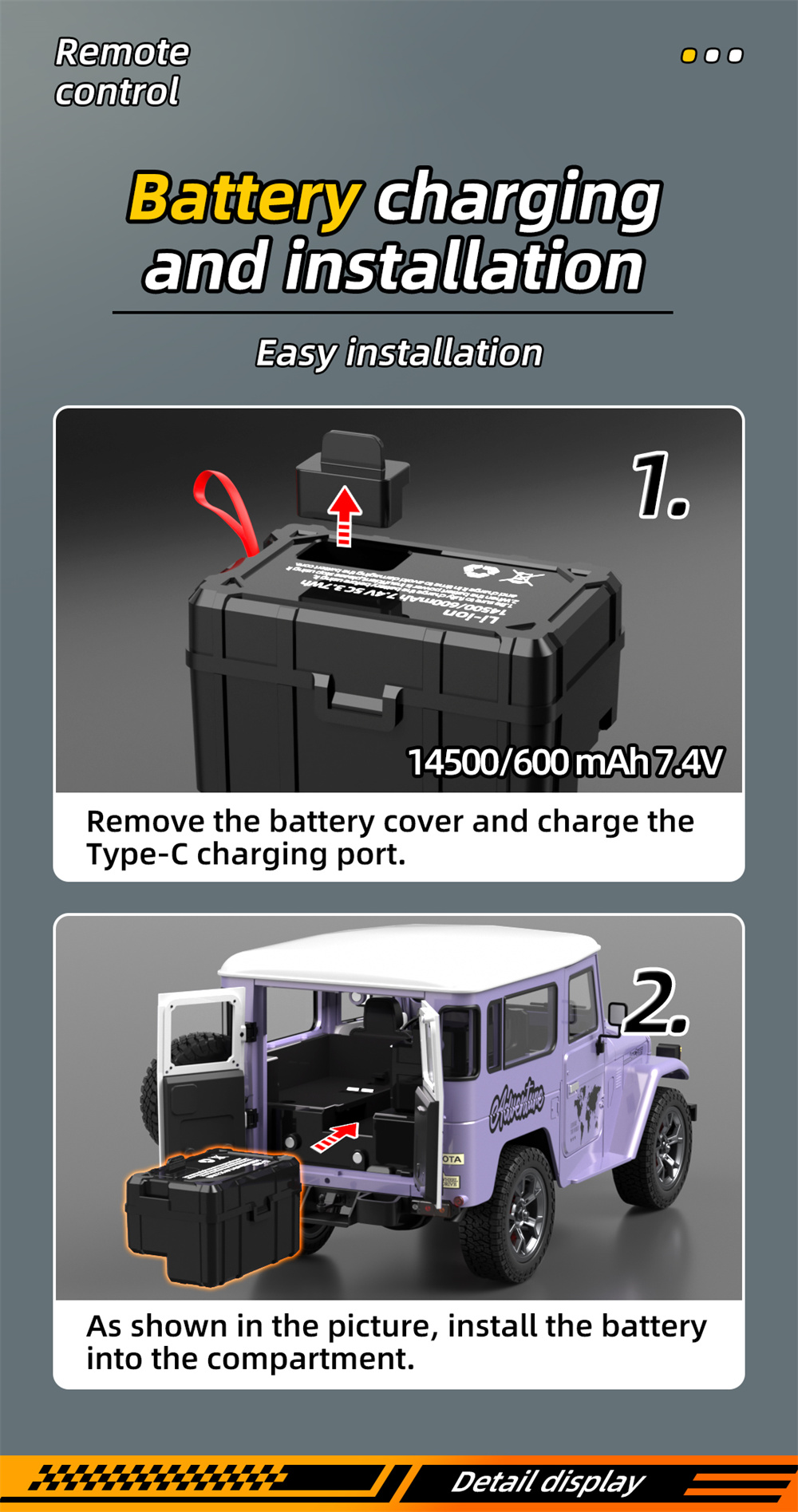 Battery for the Car:7.4V 600mAh 15C Li-ion battery(included) Battery Charging Time:About 2 hours Battery Using Time:About 30 minutes |